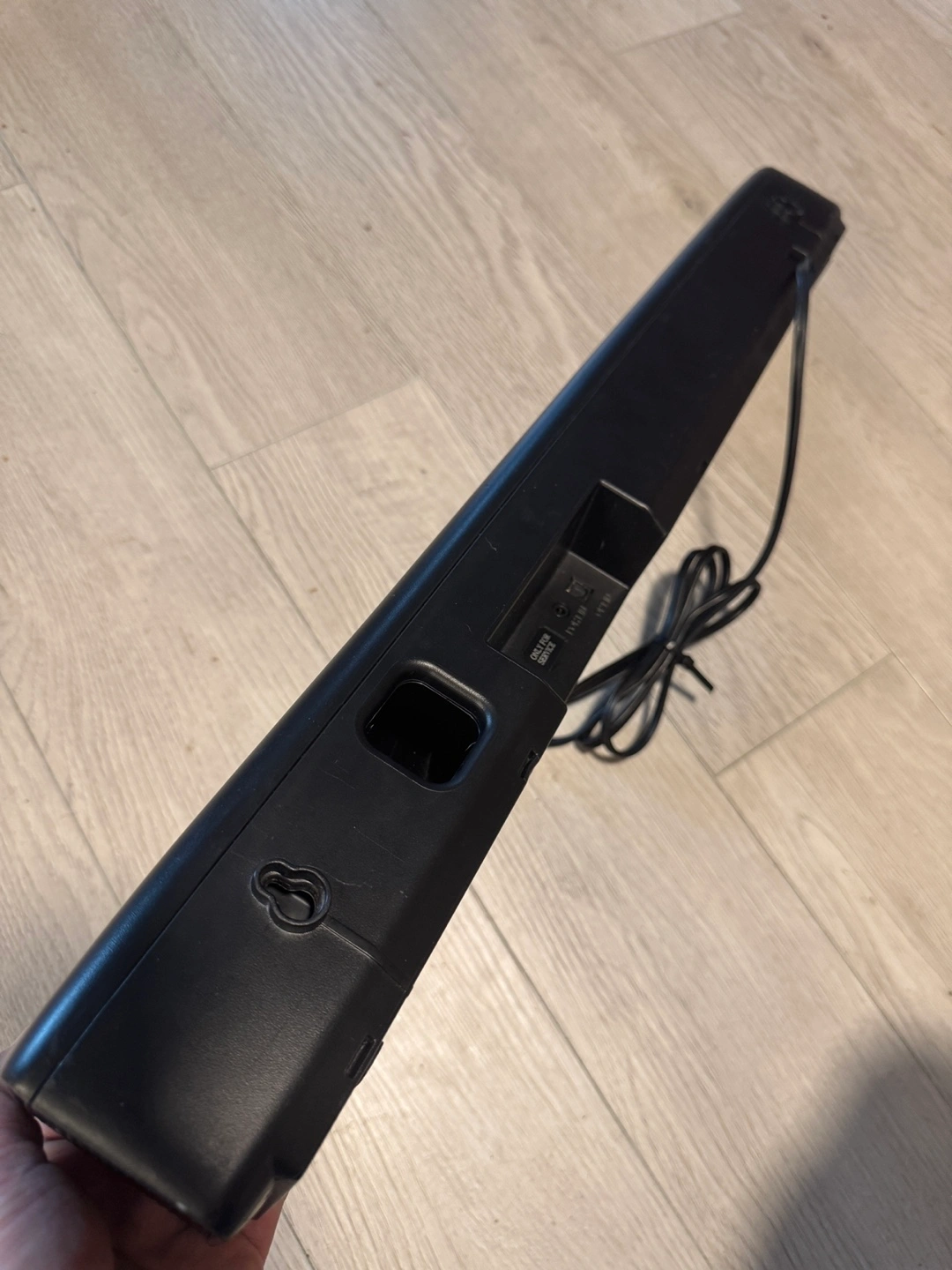 A sound bar speaker. It is a sleek black colour. The design is long and slim. There are several ports at the back. Perfect for immersing yourself in your favourite movie.