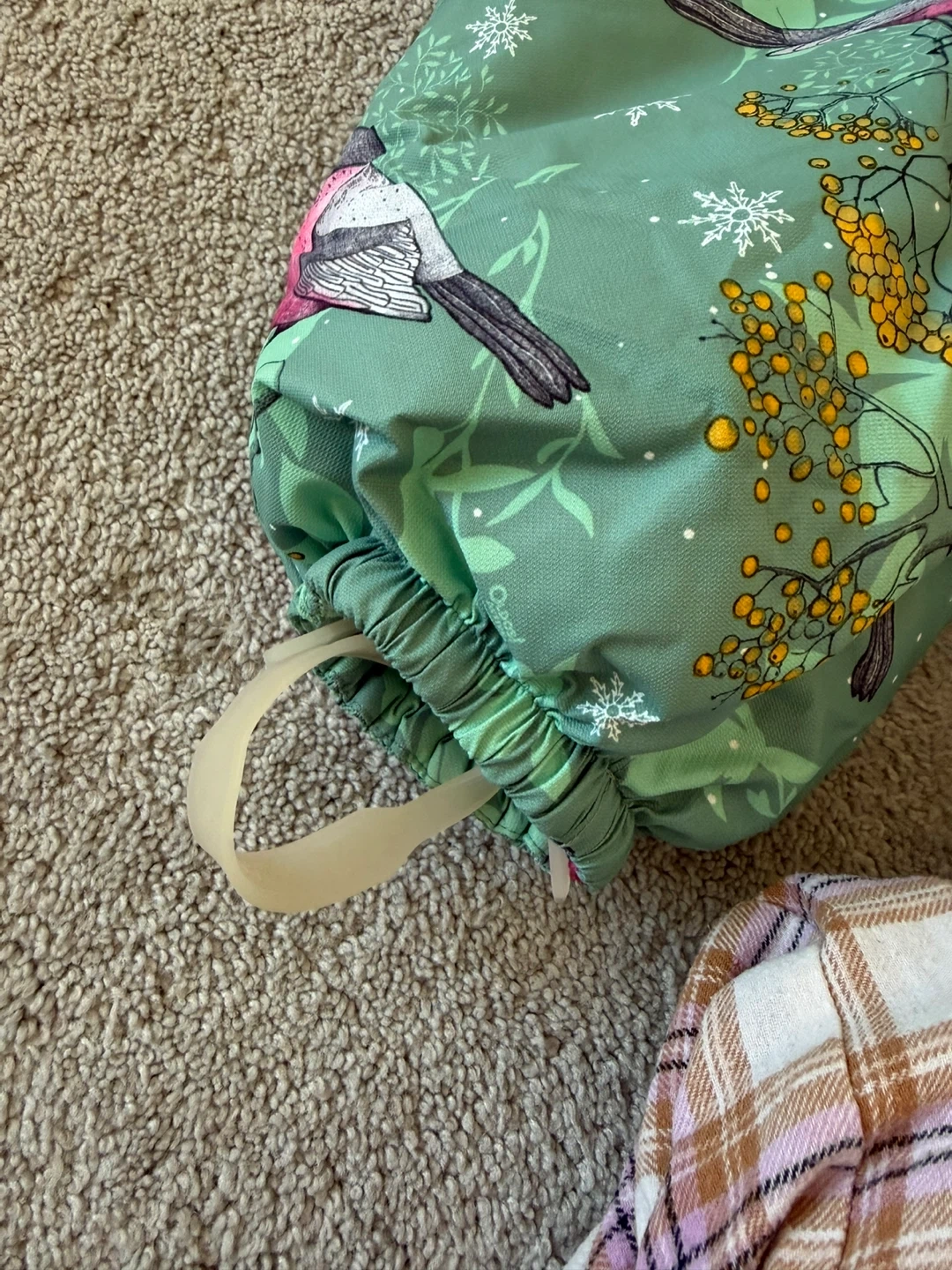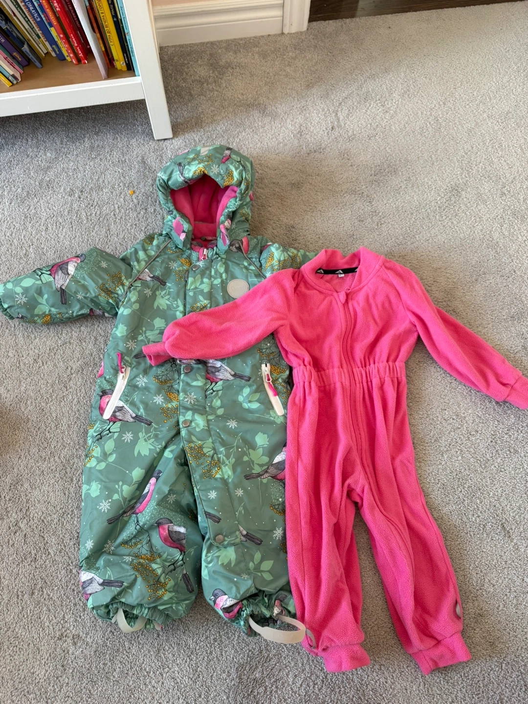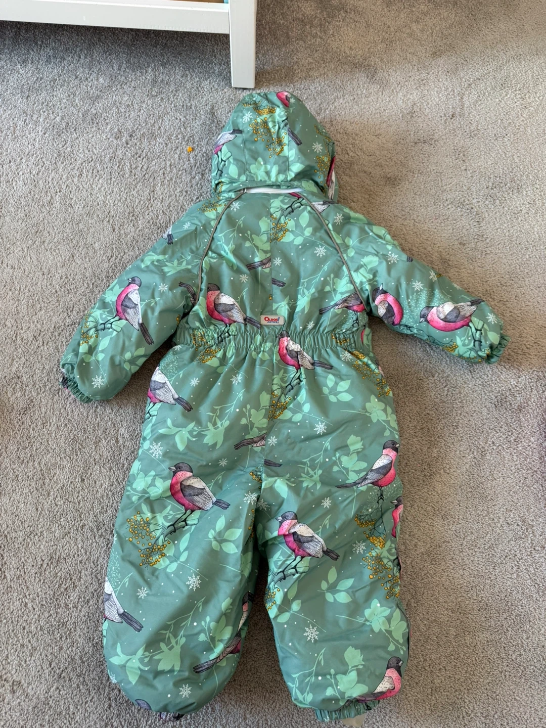 This green snowsuit features a cute bird and botanical print. It includes a hood, elasticated cuffs with stirrups, and a full-zip front. Great for keeping little ones warm and dry during winter adventures!