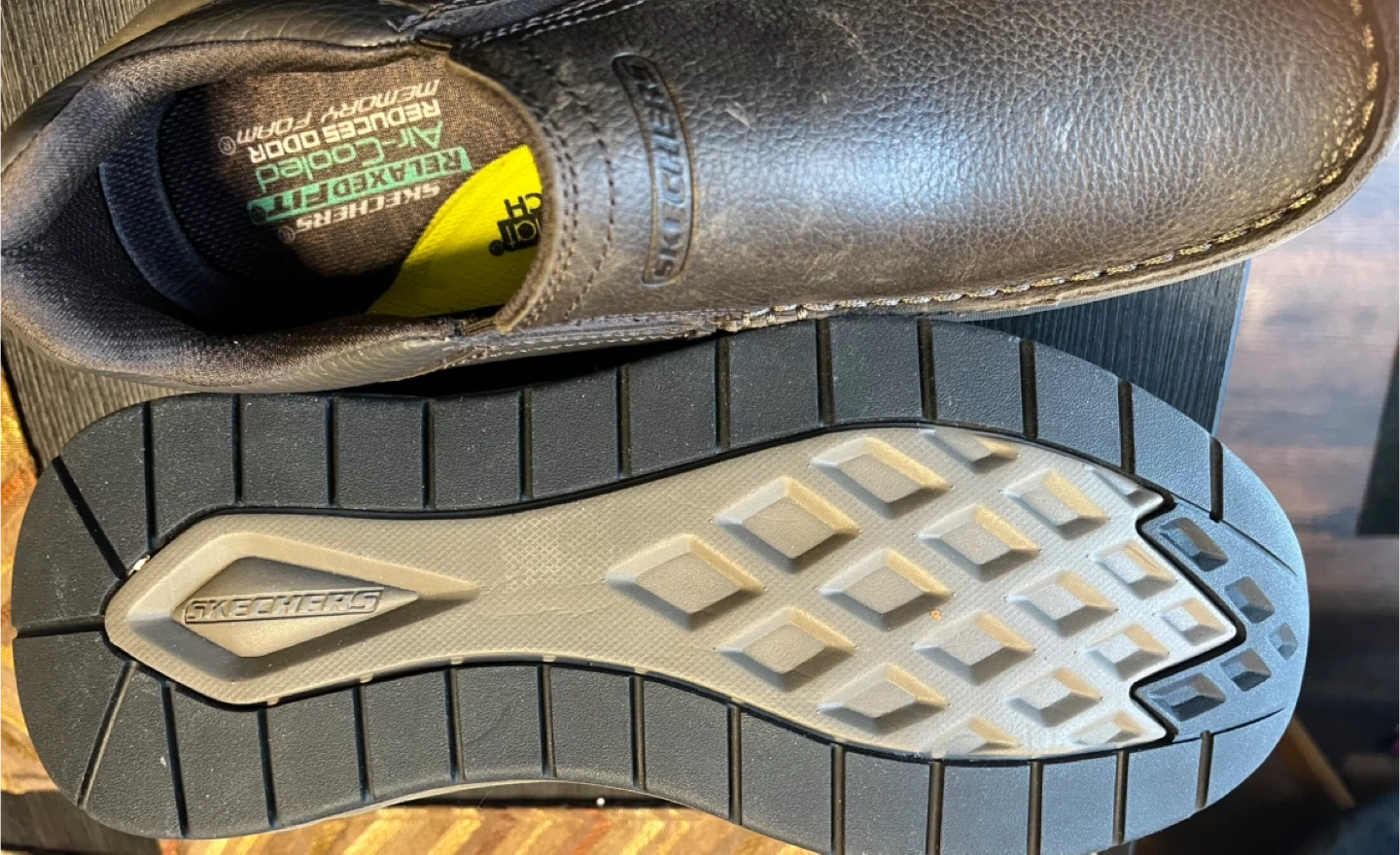Selling a pair of Skechers Calabrio Bazley men's shoes in brown. They feature an air-cooled relaxed fit and memory foam for extra comfort. Perfect for everyday wear!