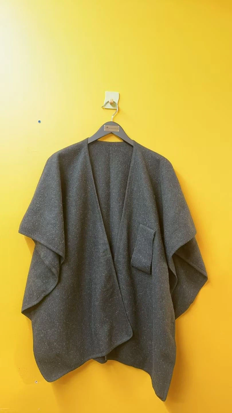 A cozy grey cape shawl made from a wool blend, perfect for layering. It features an asymmetrical wrap front with a single chest pocket. This stylish piece adds warmth and flair to any outfit.