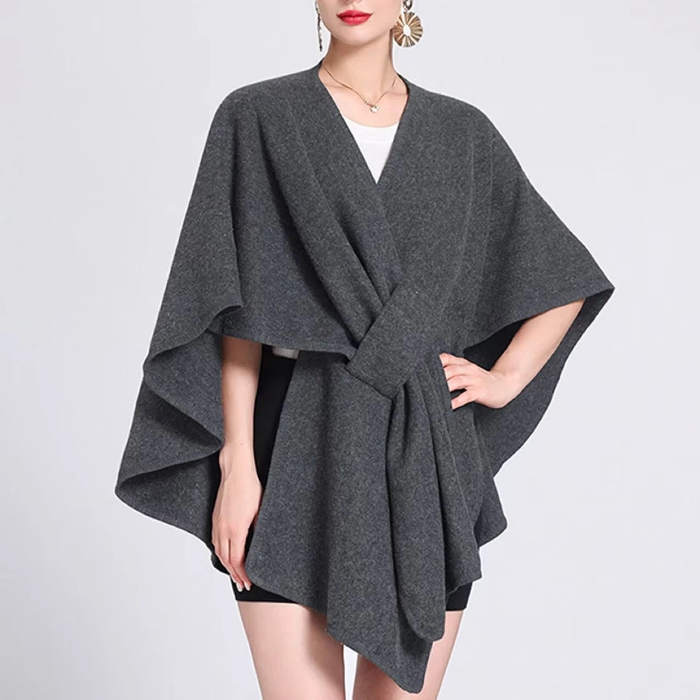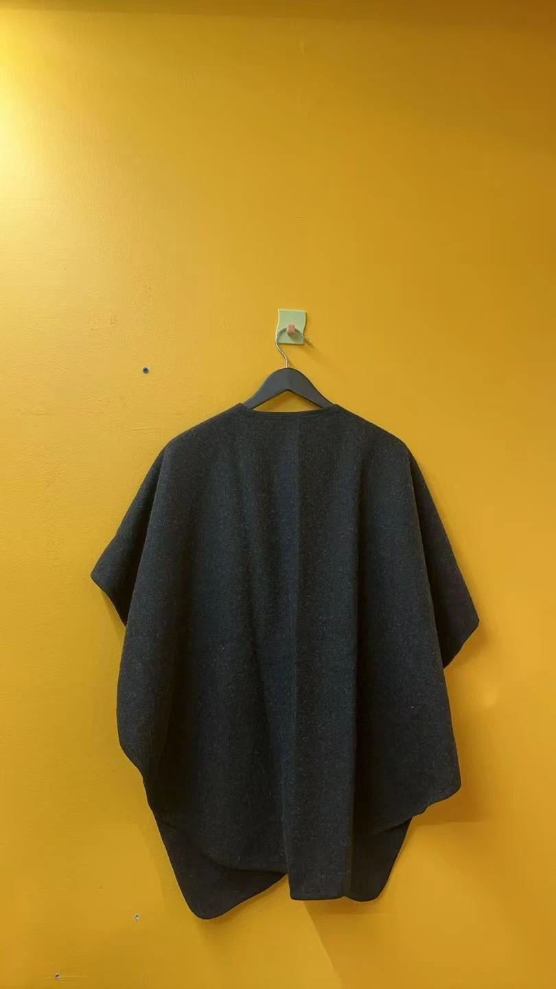 A cozy grey cape shawl made from a wool blend, perfect for layering. It features an asymmetrical wrap front with a single chest pocket. This stylish piece adds warmth and flair to any outfit.