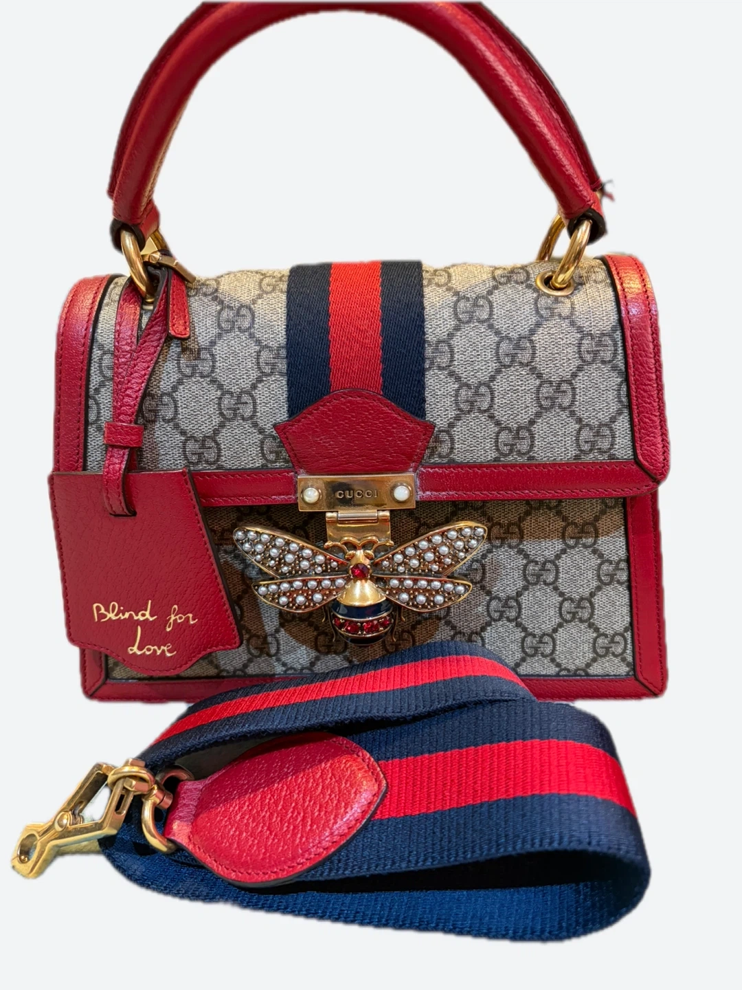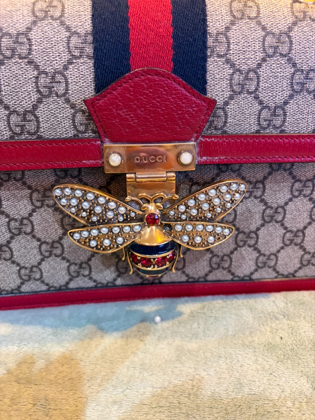 Authentic Gucci Queen Margaret bag in the iconic GG Supreme coated canvas with red leather trim. This stunning piece features the signature antiqued gold-tone bee closure, heavily embellished with pearls and red crystals.