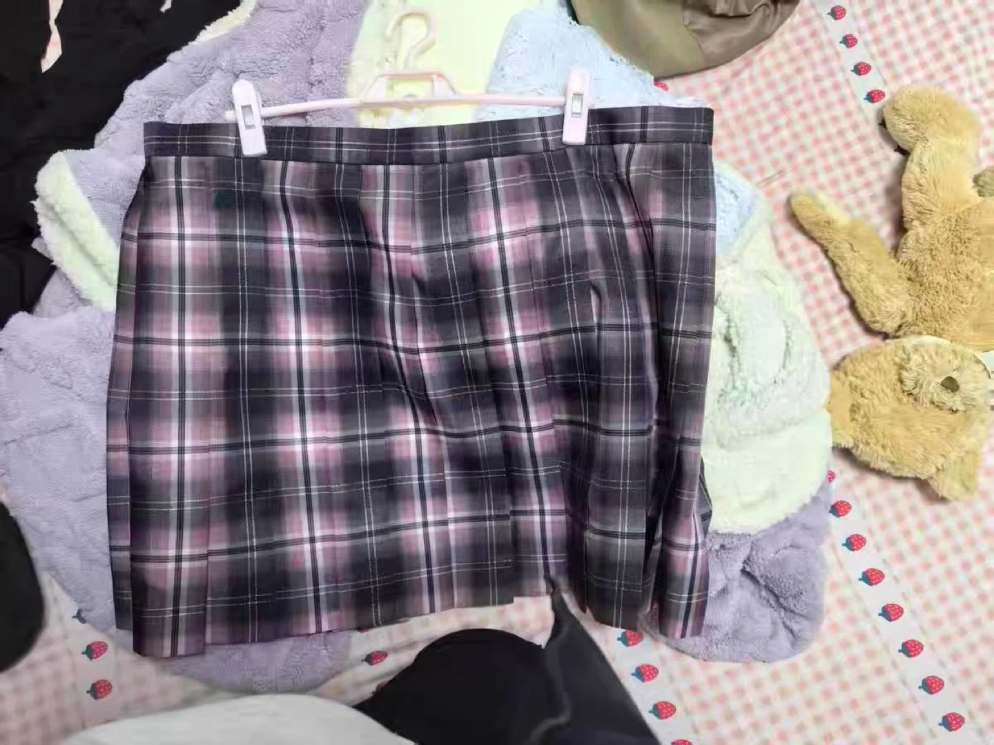 A cute plaid mini skirt with a pink and grey checkered pattern. It's made of a lightweight fabric. This skirt would be great for casual wear!