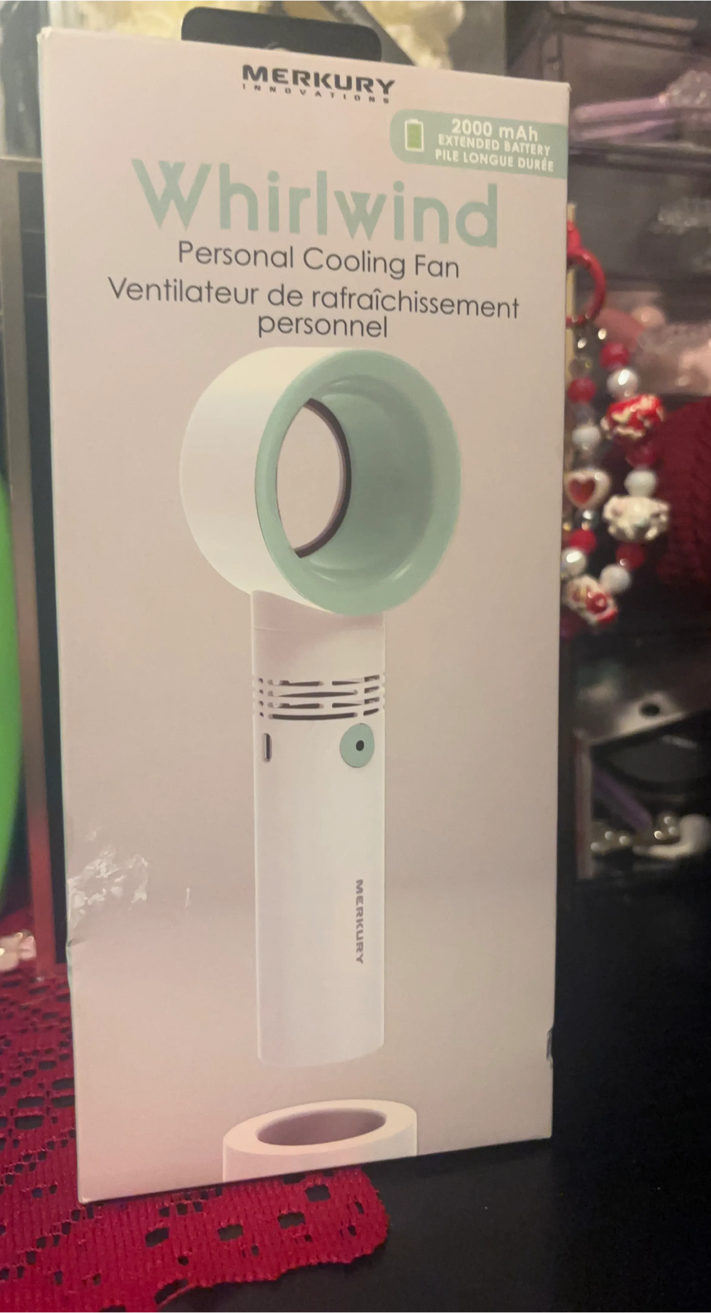 This is a Merkury Innovations Whirlwind personal cooling fan. It's powered by a 2000 mAh extended battery. Perfect for staying cool on the go!