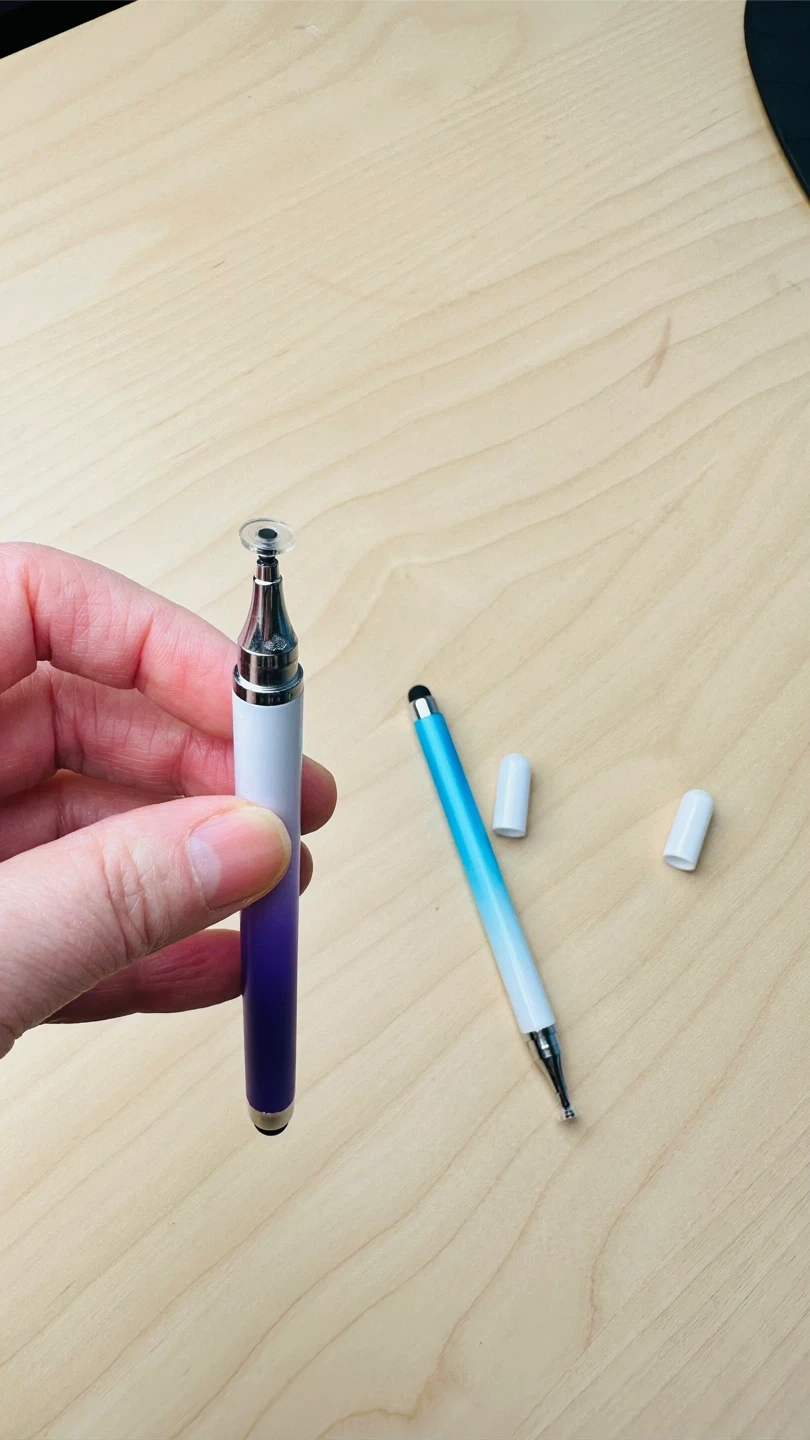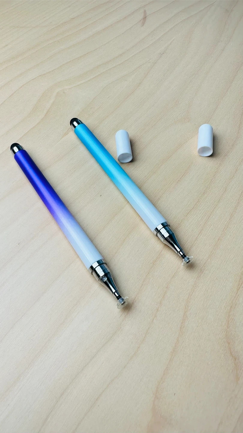 Includes two stylus pens with soft rubber tips for touchscreens. One pen has a blue to purple gradient, and the other has a blue to white gradient. Both come with caps.