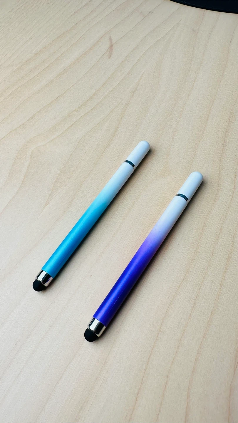 Includes two stylus pens with soft rubber tips for touchscreens. One pen has a blue to purple gradient, and the other has a blue to white gradient. Both come with caps.