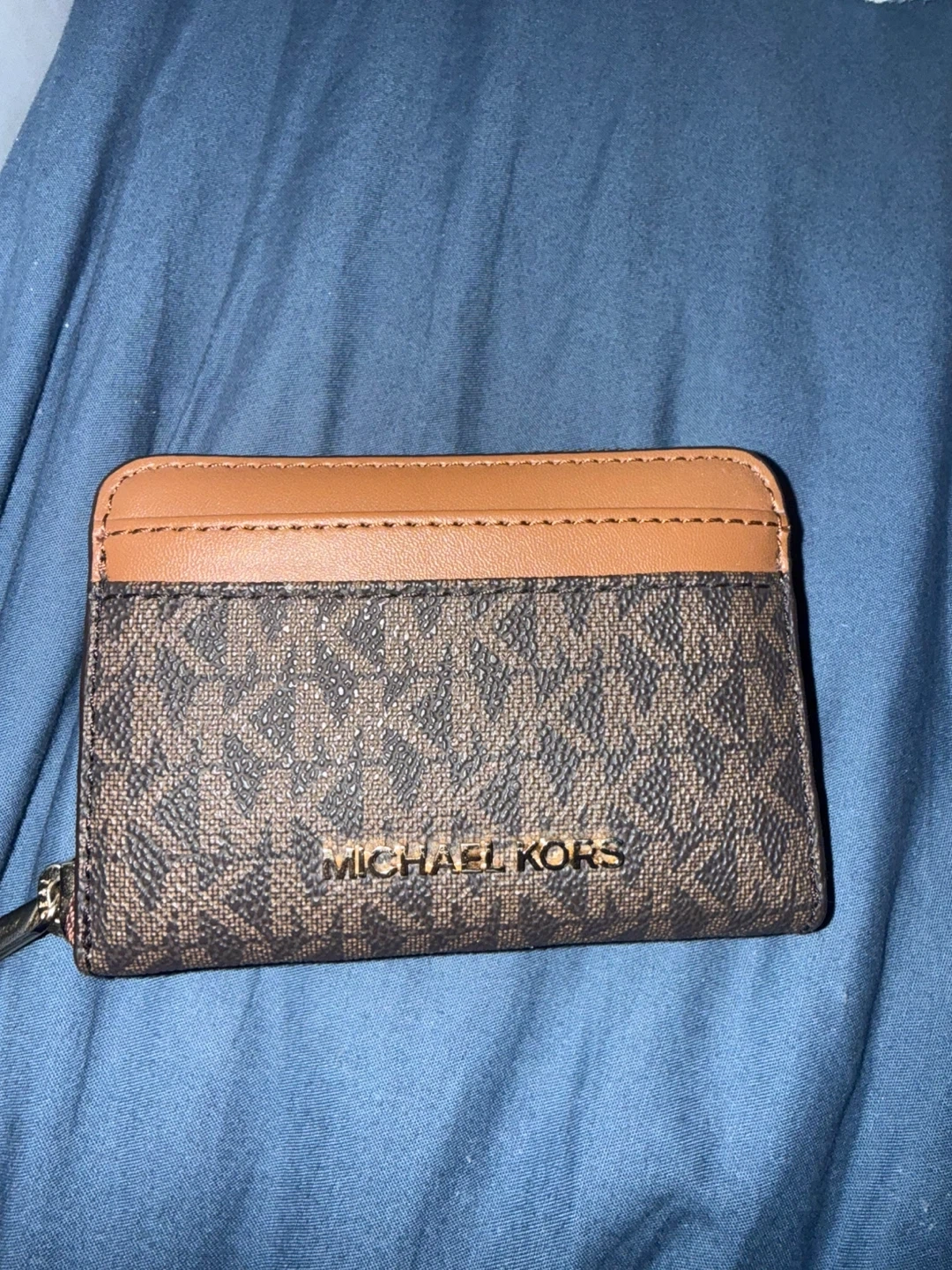 This Michael Kors card holder features the signature monogram print. It's brown with tan leather accents and a zip closure. Inside, it has card slots.