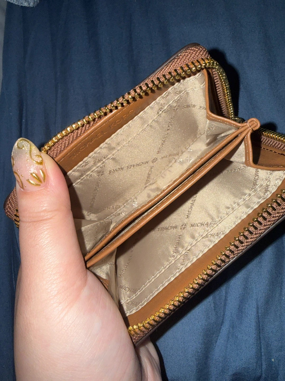 This Michael Kors card holder features the signature monogram print. It's brown with tan leather accents and a zip closure. Inside, it has card slots.