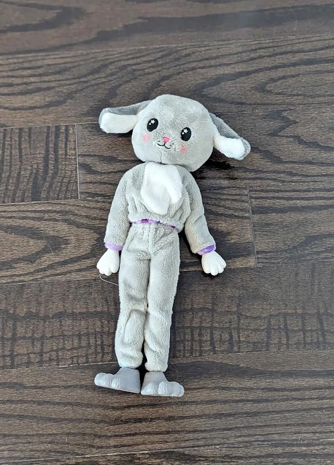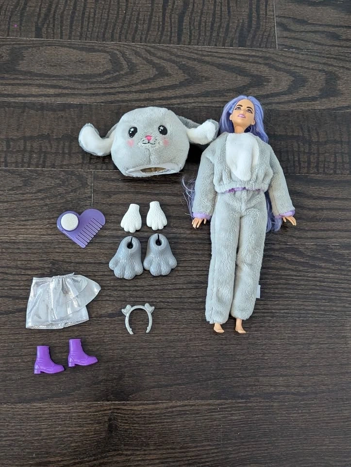 Barbie doll with cute purple hair, wearing a bunny costume. Includes plush bunny head, full body suit, two sets of hands and feet, dog ear headband, skirt, hairbrush, and boots. Pickup in Nobleton.