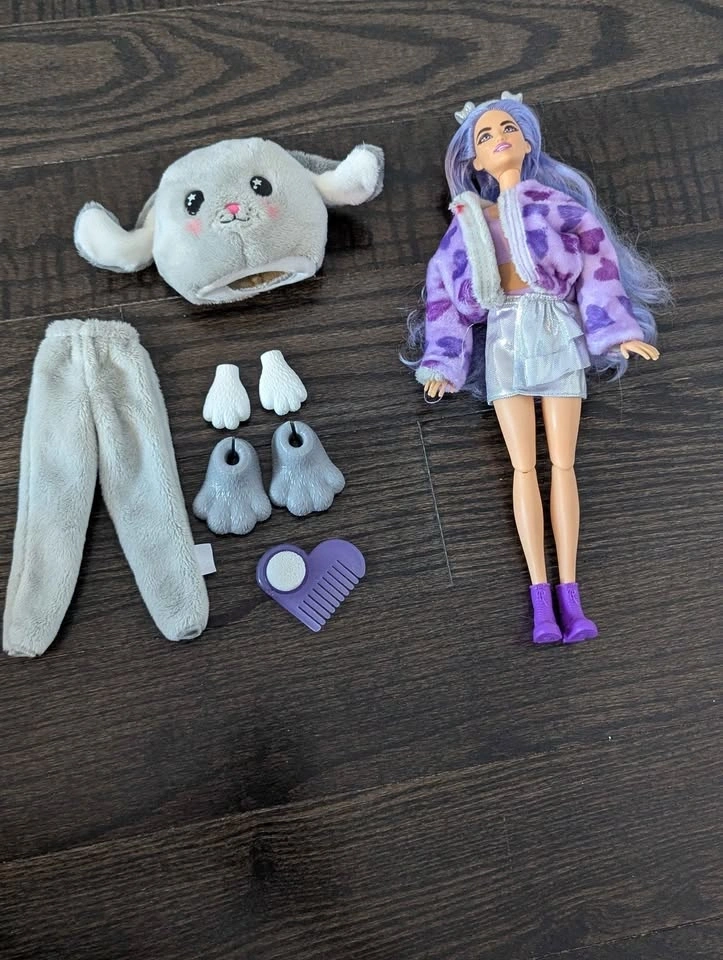 Barbie doll with cute purple hair, wearing a bunny costume. Includes plush bunny head, full body suit, two sets of hands and feet, dog ear headband, skirt, hairbrush, and boots. Pickup in Nobleton.