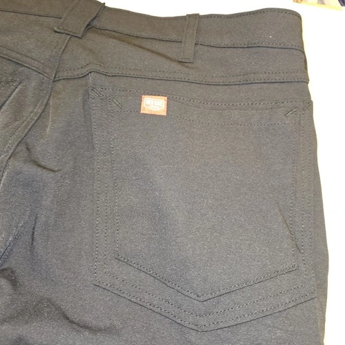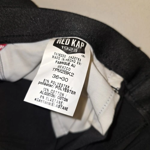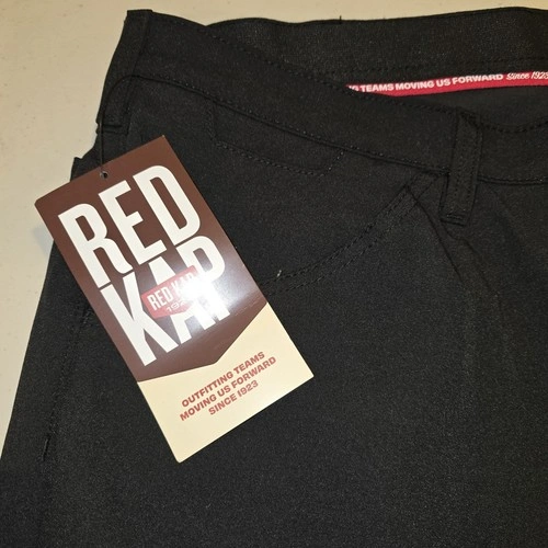 2 pairs of new with tags Red Kap cooling work pants in black, size 36x30. These pants feature a zip and button closure, a mid-rise fit, and a straight leg style. Made of a lightweight and breathable microfiber fabric, they are designed for comfort and quick dry with added stretch for flexibility. The pants also have slash pockets and are water-resistant, making them ideal for summer, fall, and spring seasons. The chino style and classic black color make them suitable for workwear occasions, while the Red Kap brand ensures quality and durability.