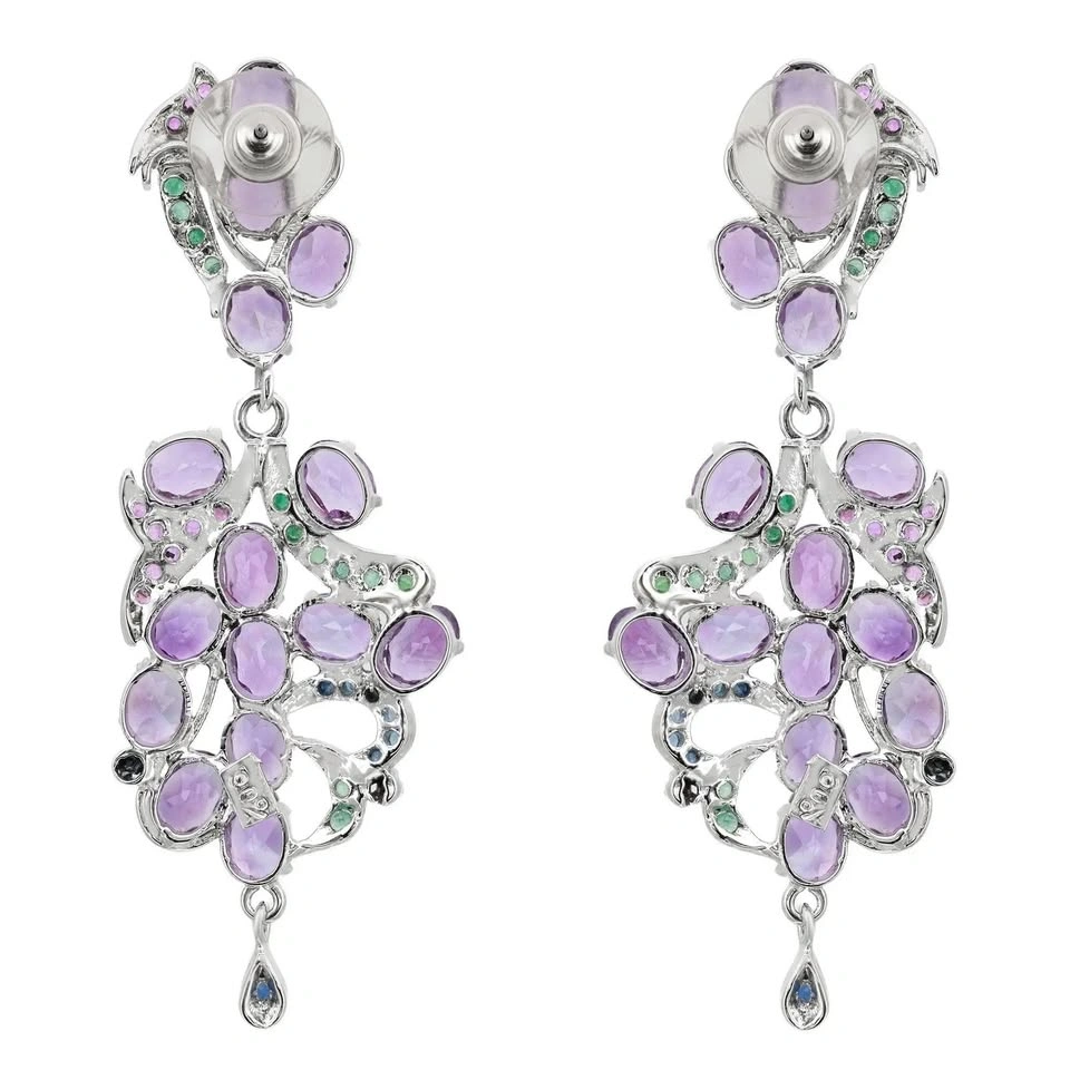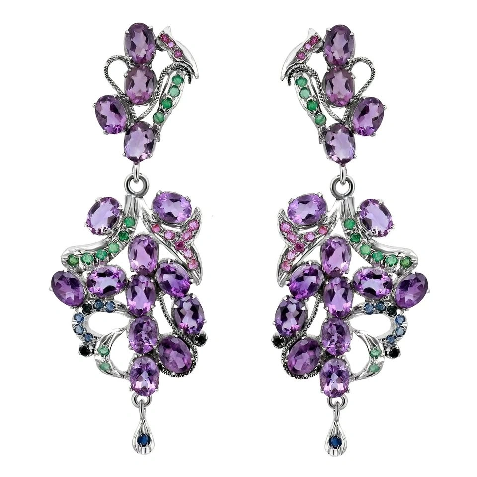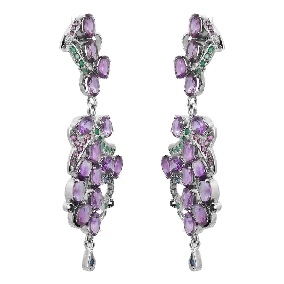 These stunning drop earrings, measuring an impressive 3 inches in length, gracefully swing and sparkle with their abstract design. Adorned with oval-cut amethysts set in prongs, they are beautifully complemented by round-cut rubies, emeralds, and blue sapphires. Crafted from 90% silver, these earrings weigh a total of 22.30 grams and are in excellent pre-owned condition, ready to add a touch of elegance to any ensemble.