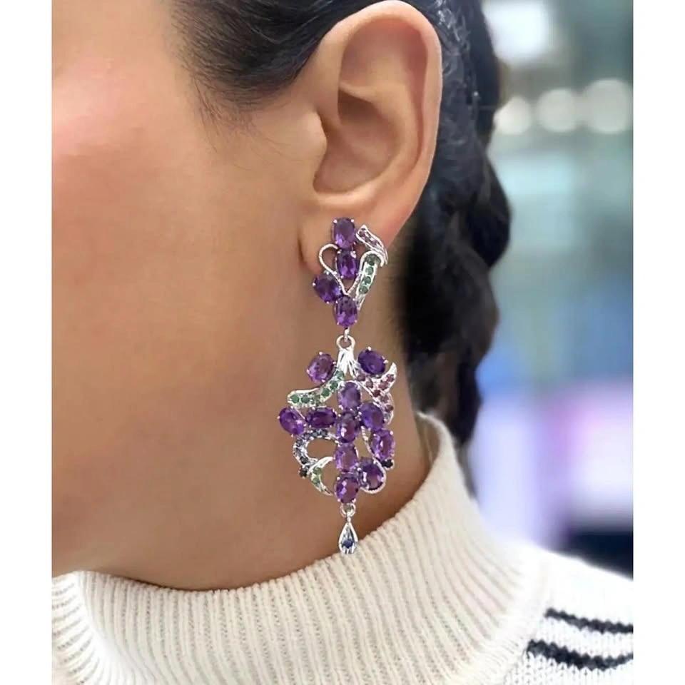 These stunning drop earrings, measuring an impressive 3 inches in length, gracefully swing and sparkle with their abstract design. Adorned with oval-cut amethysts set in prongs, they are beautifully complemented by round-cut rubies, emeralds, and blue sapphires. Crafted from 90% silver, these earrings weigh a total of 22.30 grams and are in excellent pre-owned condition, ready to add a touch of elegance to any ensemble.