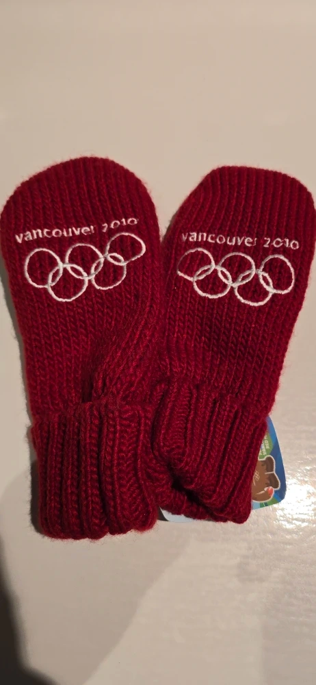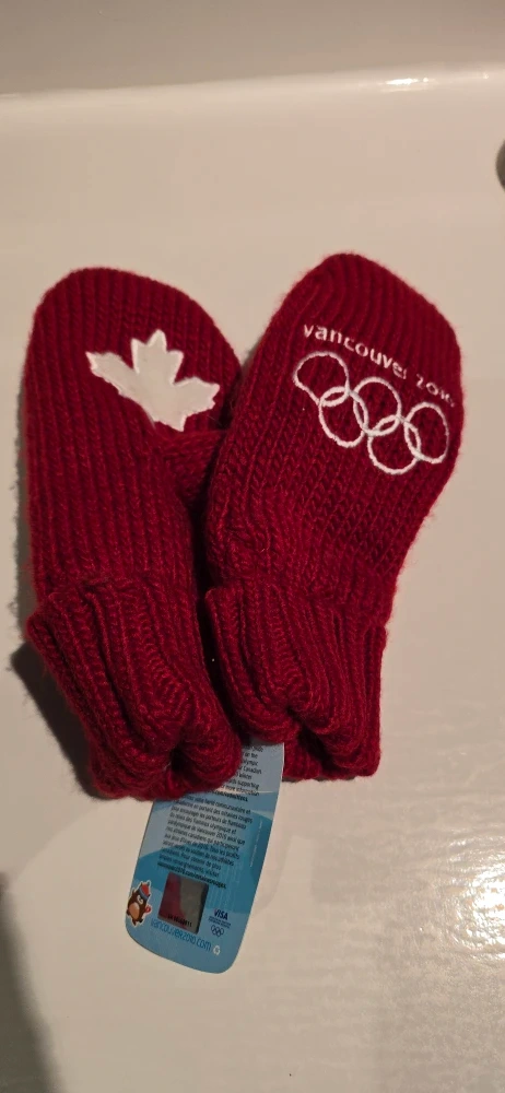 Keep your little one warm with these adorable red mittens! They feature the Vancouver 2010 Olympic logo and a Canadian maple leaf design. Perfect for keeping tiny hands cozy during the colder months