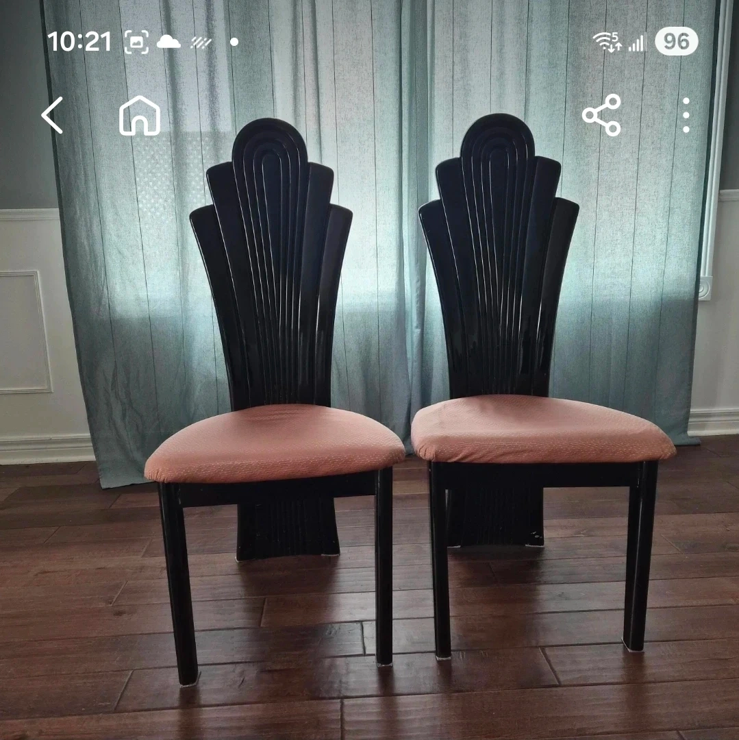 I have 2 available. Features a unique fan-shaped black lacquered wood backrest. The seat is upholstered in a peachy-pink textured fabric. A distinctive accent chair that adds vintage flair to any dining space. Selling each for $65.