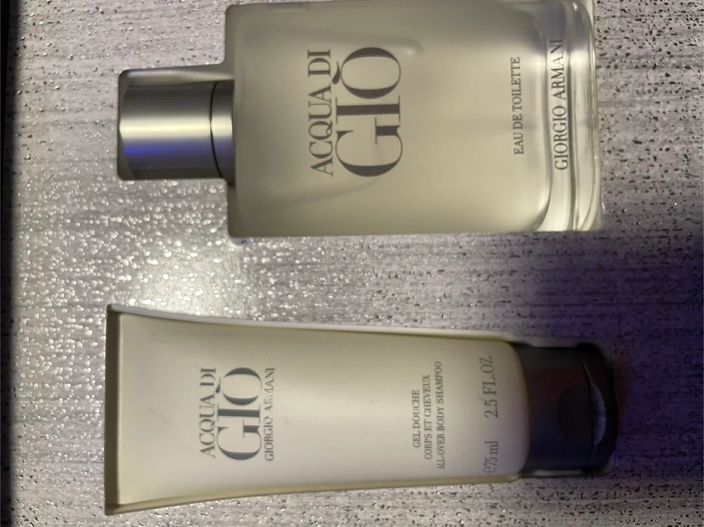 Giorgio Armani Acqua Di Gio fragrance set. Includes Eau de Toilette and All-Over Body Shampoo. The Eau de Toilette is 75ml and the body shampoo is 75ml (2.5 FL.OZ).