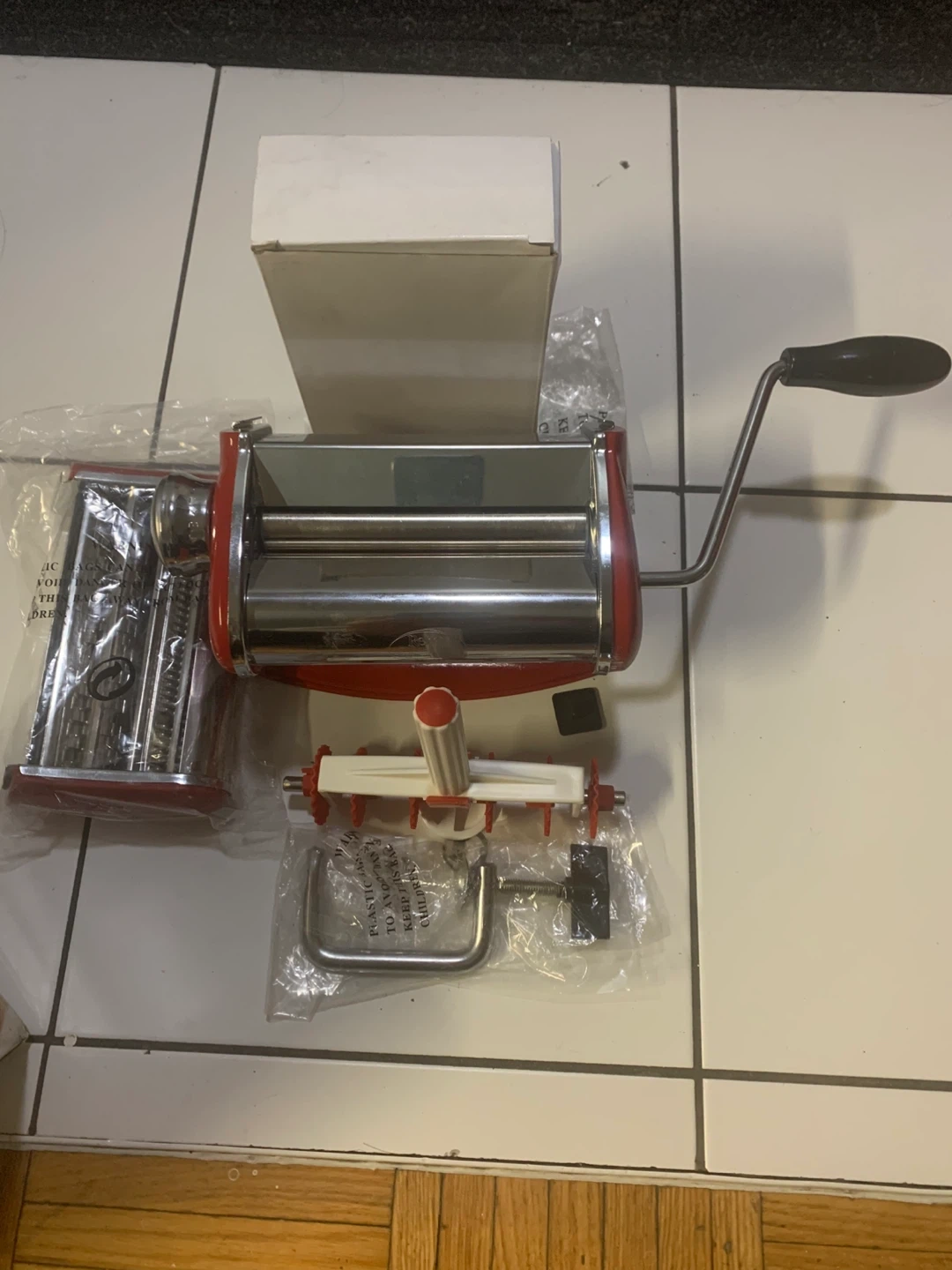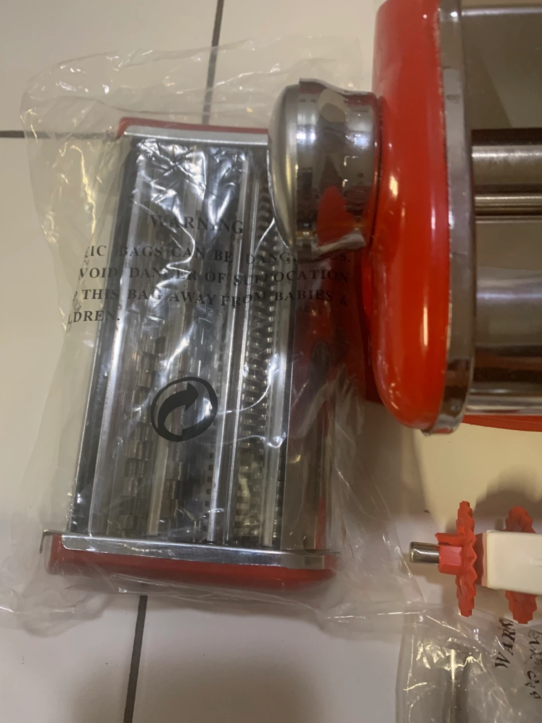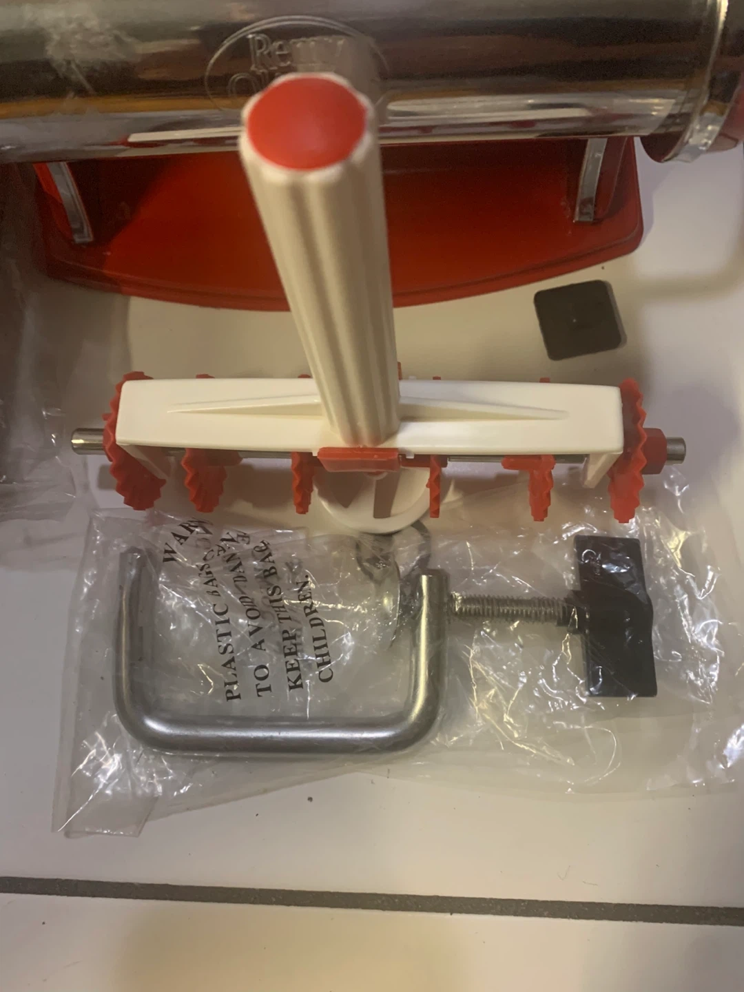This Remy Olivier pasta machine is red and comes with various attachments for different pasta shapes. It includes the main machine, a crank handle, a C-clamp for securing it to a counter, and a separate attachment with rollers. It's great for making fresh pasta at home!