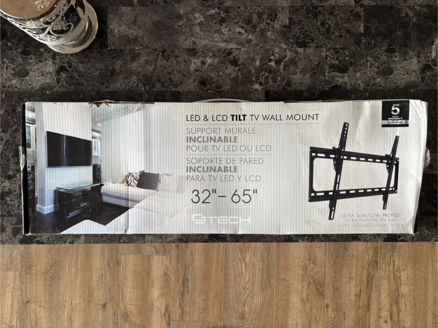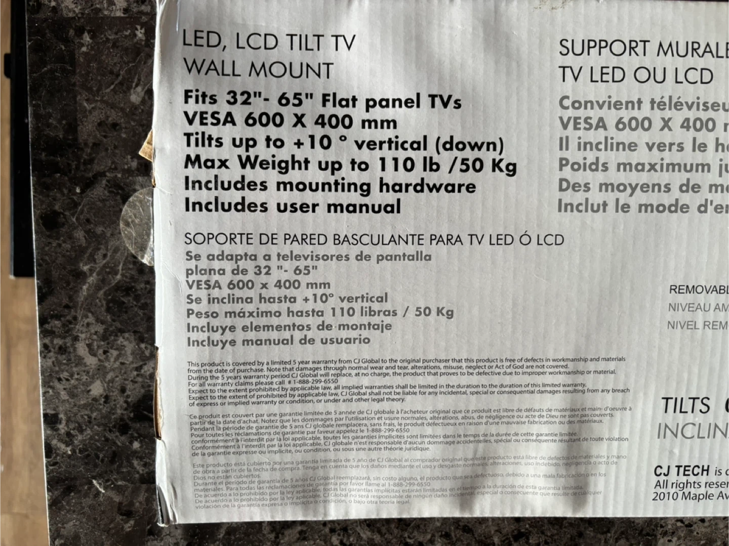 Never used. Selling a CJ Tech LED/LCD Tilt TV Wall Mount. It fits 32"-65" flat panel TVs and supports VESA 600 x 400 mm. It tilts up to +10° vertical and has a max weight capacity of up to 110 lb / 50 kg. Includes mounting hardware and user manual