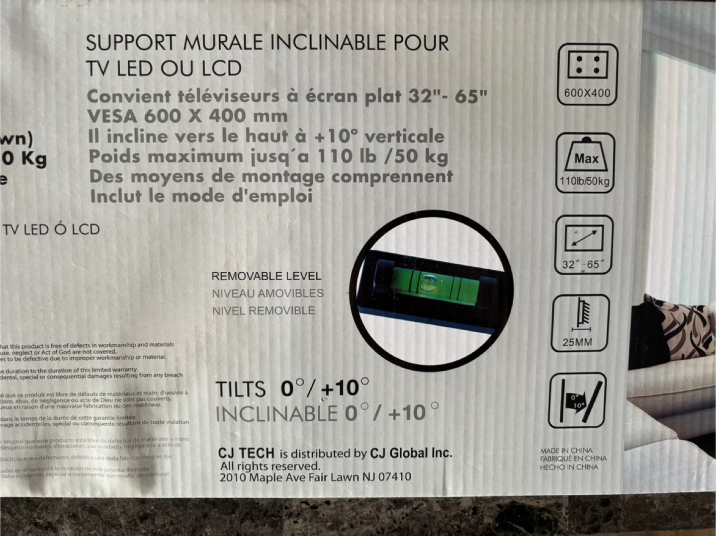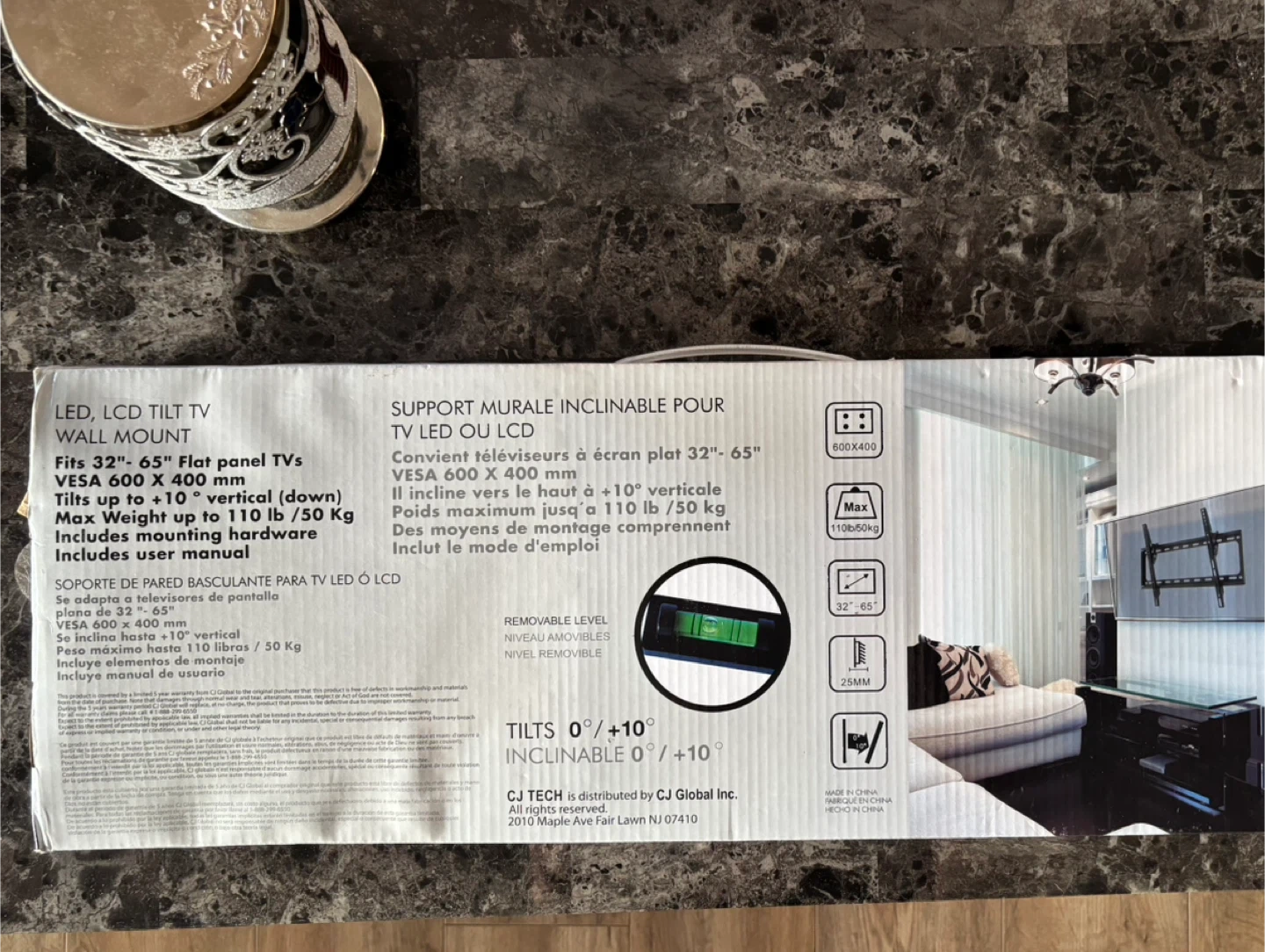 Never used. Selling a CJ Tech LED/LCD Tilt TV Wall Mount. It fits 32"-65" flat panel TVs and supports VESA 600 x 400 mm. It tilts up to +10° vertical and has a max weight capacity of up to 110 lb / 50 kg. Includes mounting hardware and user manual