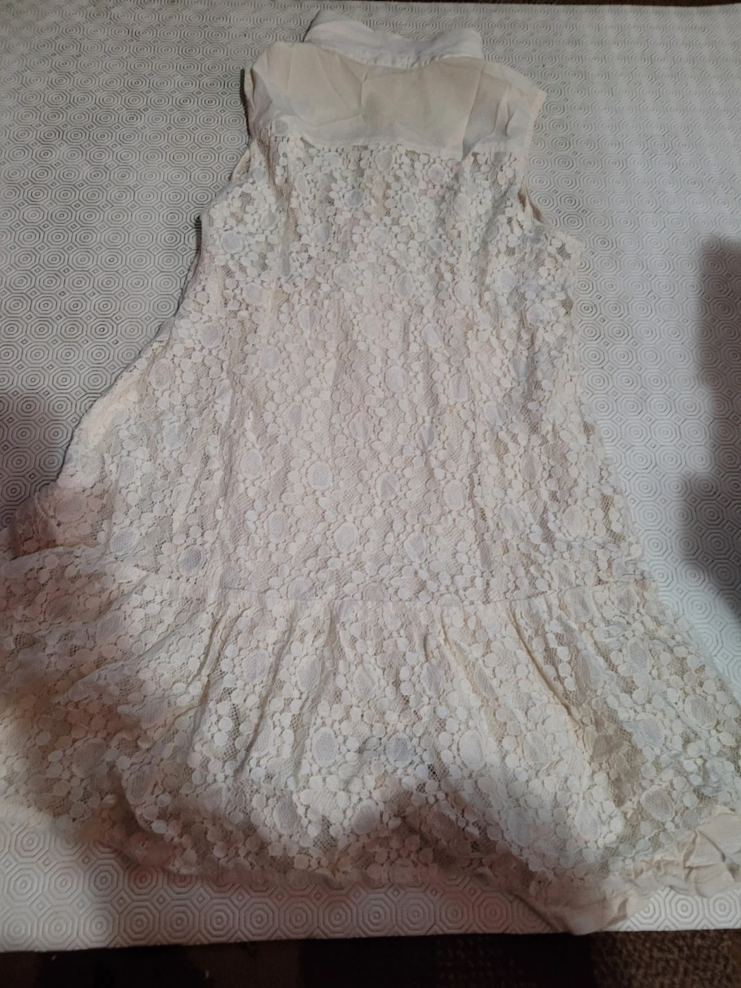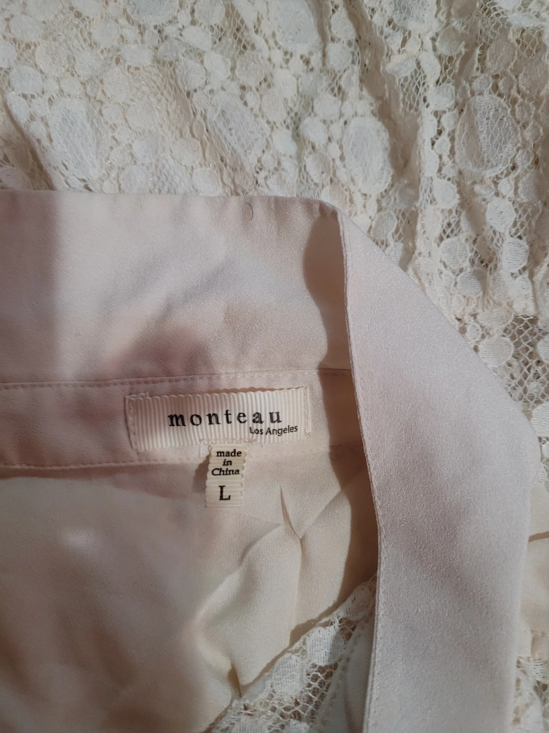 This is a cream-coloured lace dress from Monteau. It's a sleeveless design with a collared neckline and button-up front. The dress is made in China and is a size large.