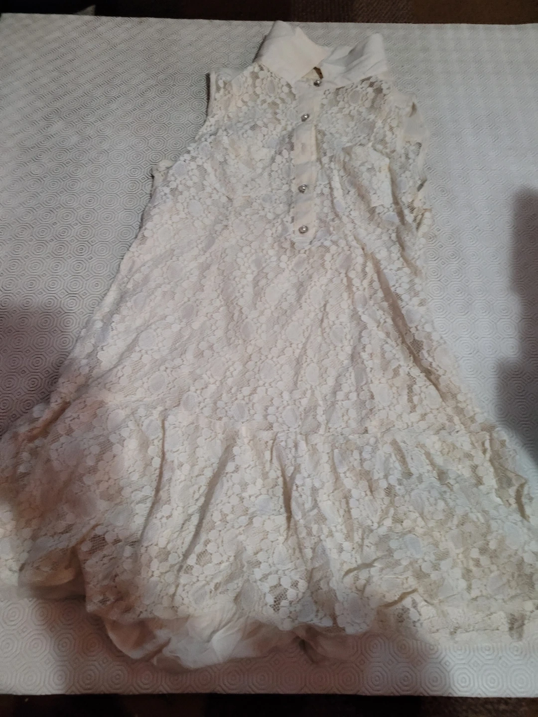 This is a cream-coloured lace dress from Monteau. It's a sleeveless design with a collared neckline and button-up front. The dress is made in China and is a size large.