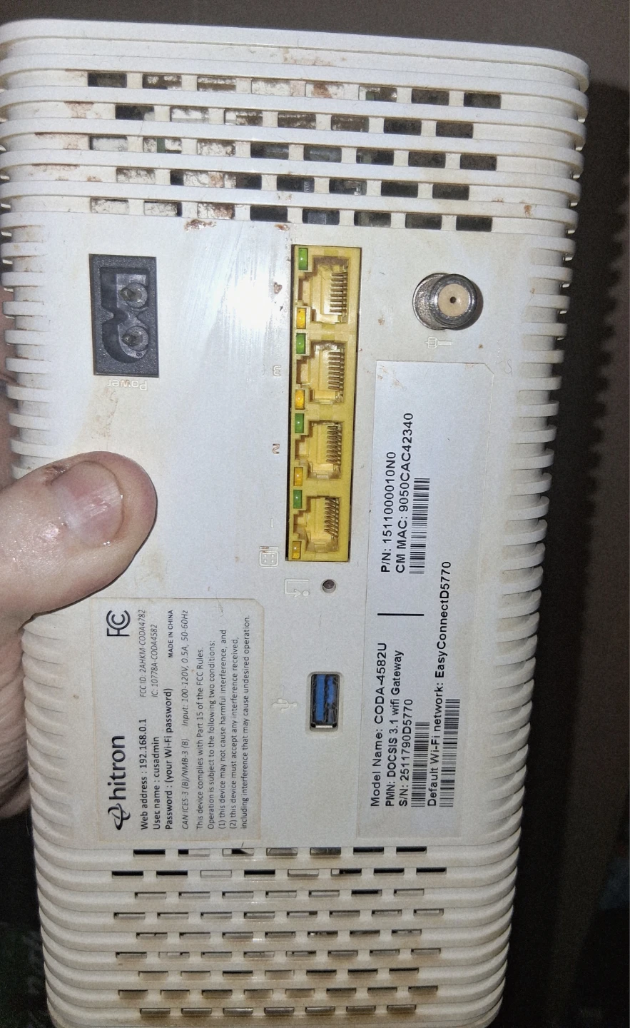 Free. This is a Hitron DOCSIS 3.1 wifi gateway. It supports input from 100-120V at 0.5A, 50-60Hz. The default Wi-Fi network name is EasyConnectD5770. Not much else is known of it. Does it work, I don't know. Pick up only unless near the intersection of Oxford and Gammage Street.