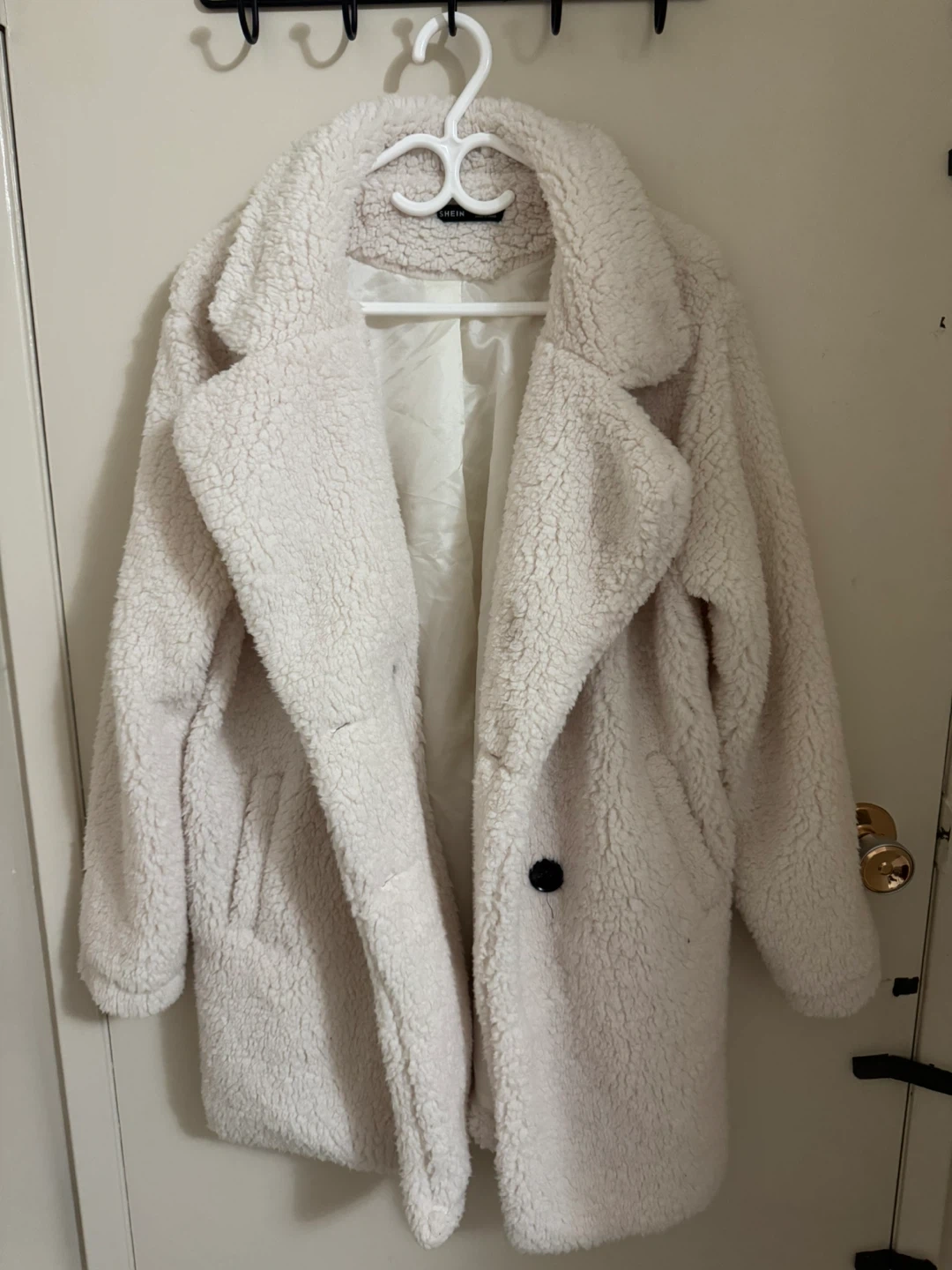 Cozy cream teddy coat by SHEIN. Features a relaxed fit and button closure. Made with soft, plush material. Great for keeping warm on chilly days!