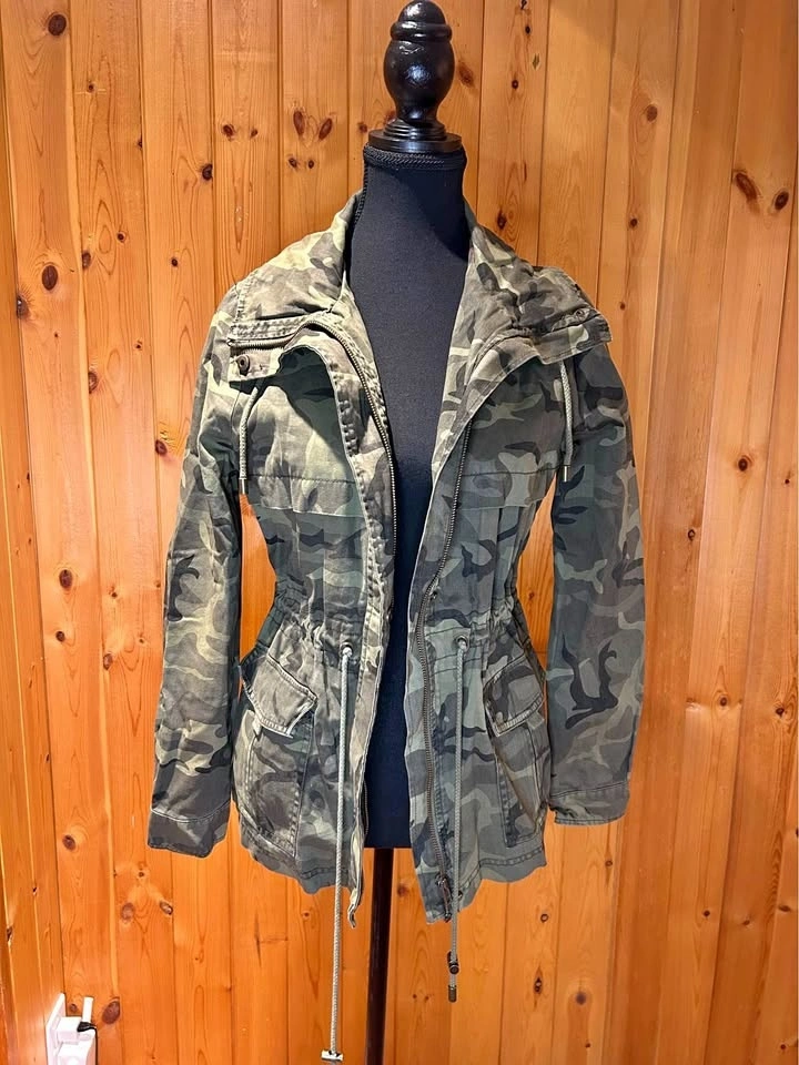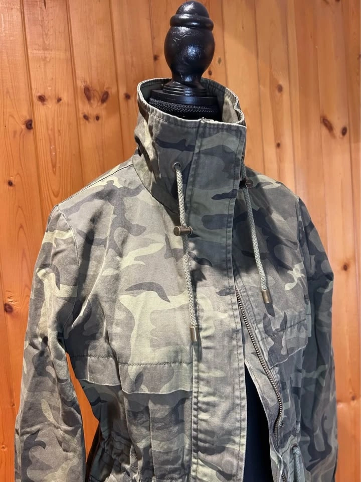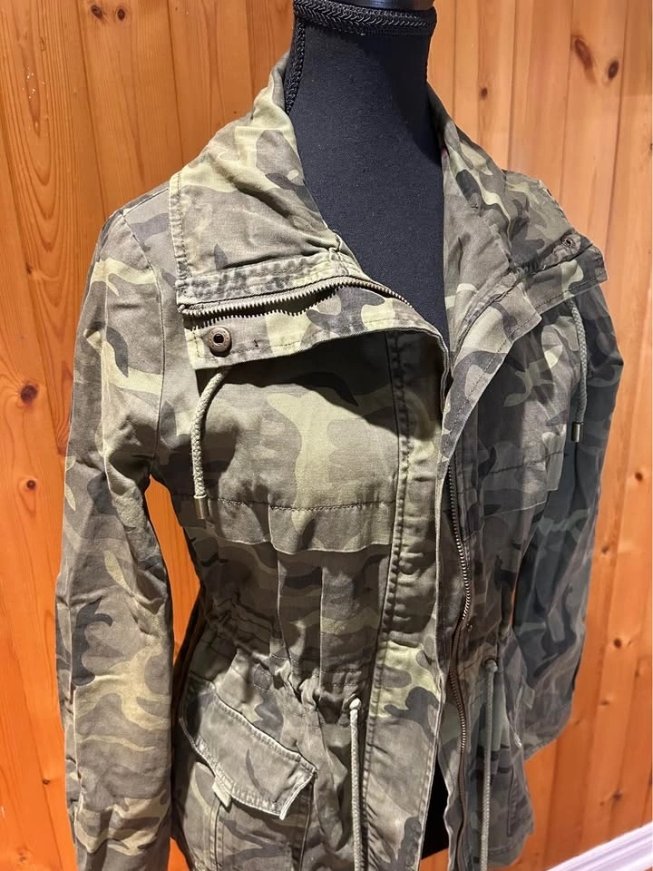 Gently used camouflage utility jacket with zip and snap front closure and adjustable drawstring waist. Size: Missing label fits XS/S. Pick up: Mississauga near Mavis & Rathburn OR Toronto near Queen St E & Parliament.