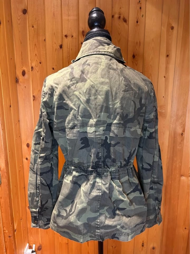 Gently used camouflage utility jacket with zip and snap front closure and adjustable drawstring waist. Size: Missing label fits XS/S. Pick up: Mississauga near Mavis & Rathburn OR Toronto near Queen St E & Parliament.