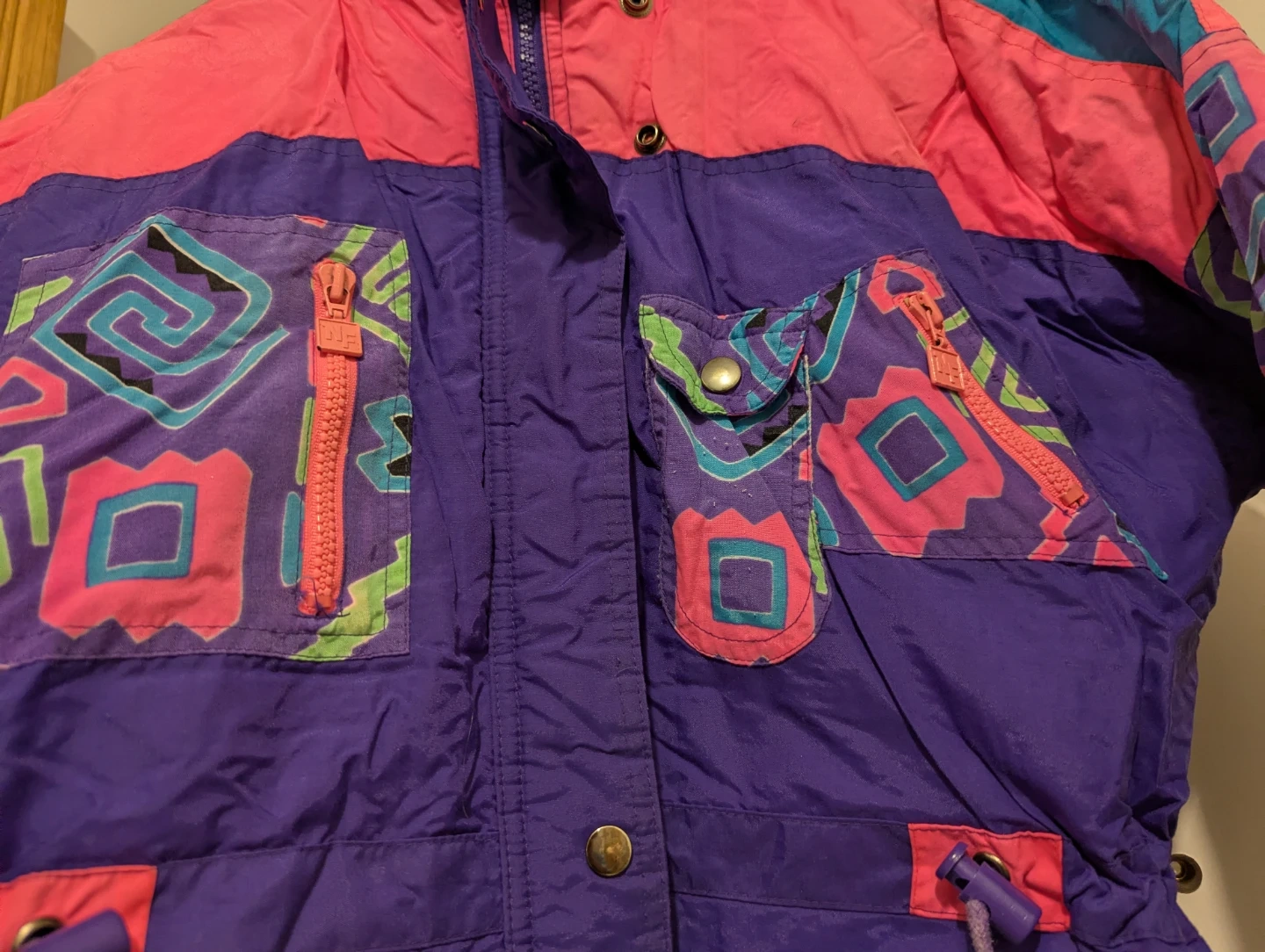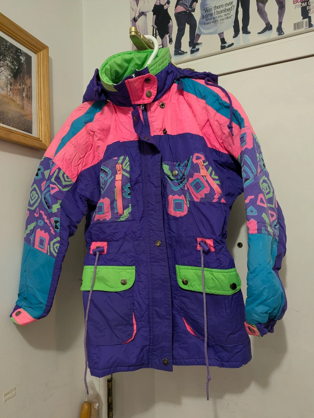 This is a vintage ski jacket in a size 14. It's made of nylon and features a fun, colourful 80s-inspired design. Multiple pockets and a hood are included. This jacket is perfect for hitting the slopes or for anyone who loves retro winter fashion!