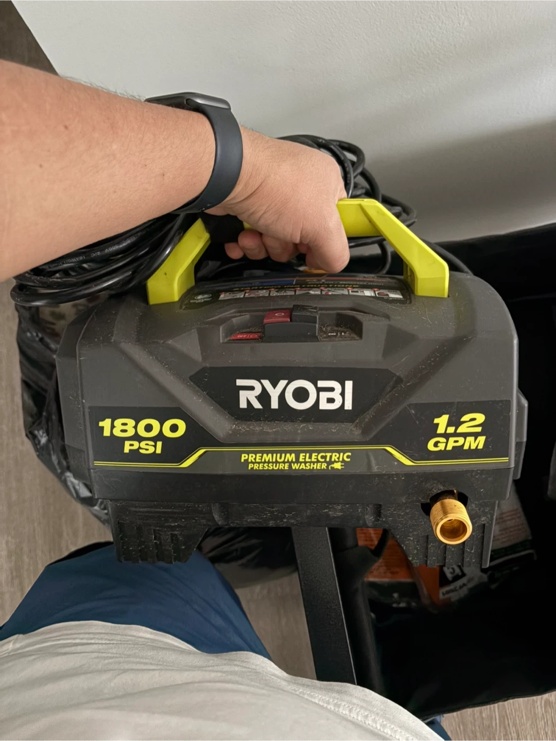 This Ryobi pressure washer delivers 1800 PSI and 1.2 GPM. It includes the pressure washer gun and hose. Perfect for getting your car or driveway cleaned up!