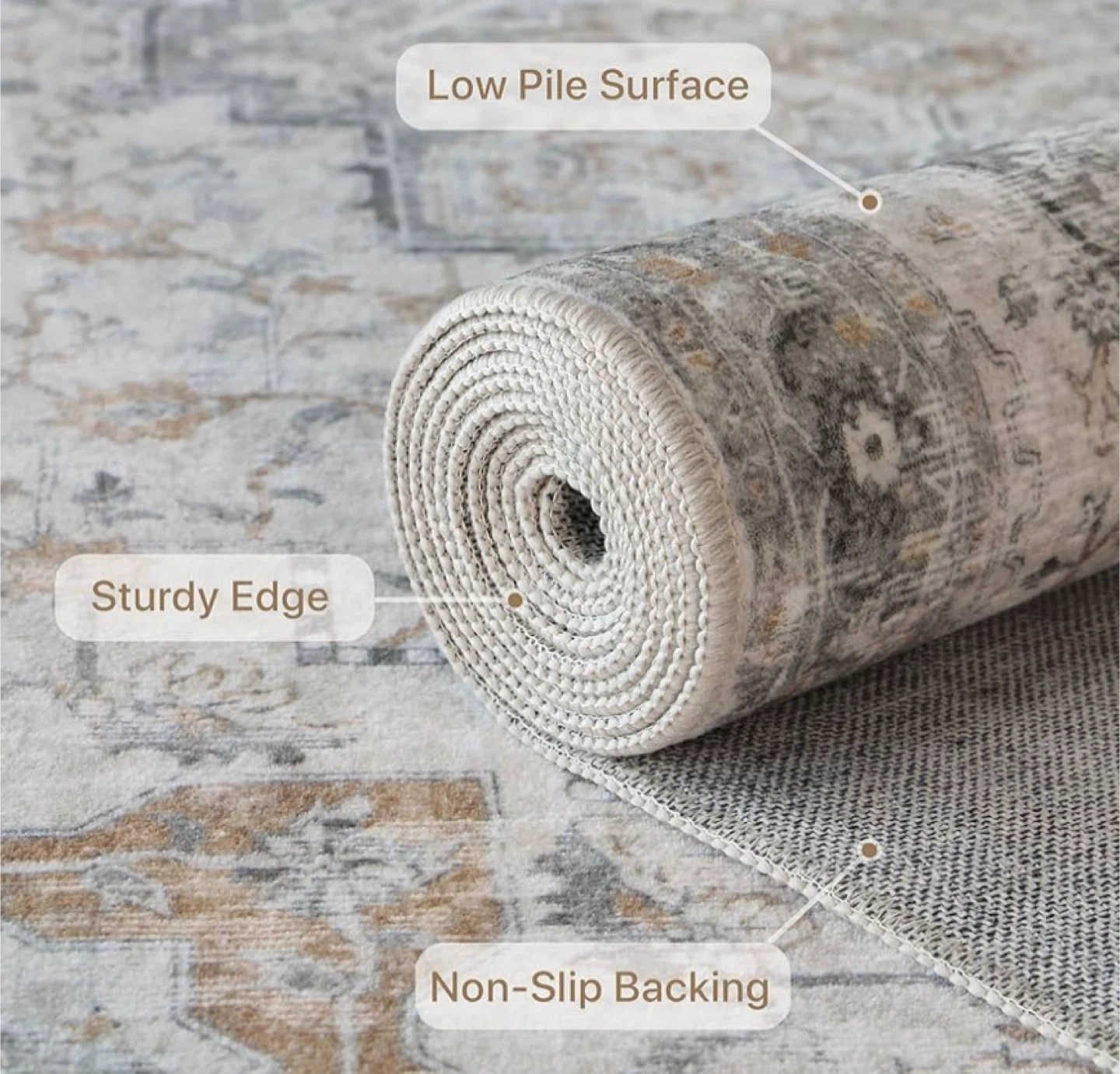 Long-lasting Rug: Made with long-lasting fibers and dense machine weaving, our low-pile rug stands up to heavy foot traffic. The soft surface is non-shedding, soundproof, and helps hide stains. The sturdy square edge brings extra resilience, making it suitable for high-traffic areas like the living room, dining room, and office. Any creases can be easily smoothed by rolling the rug in the opposite direction and weighting it down for 24 hours.
