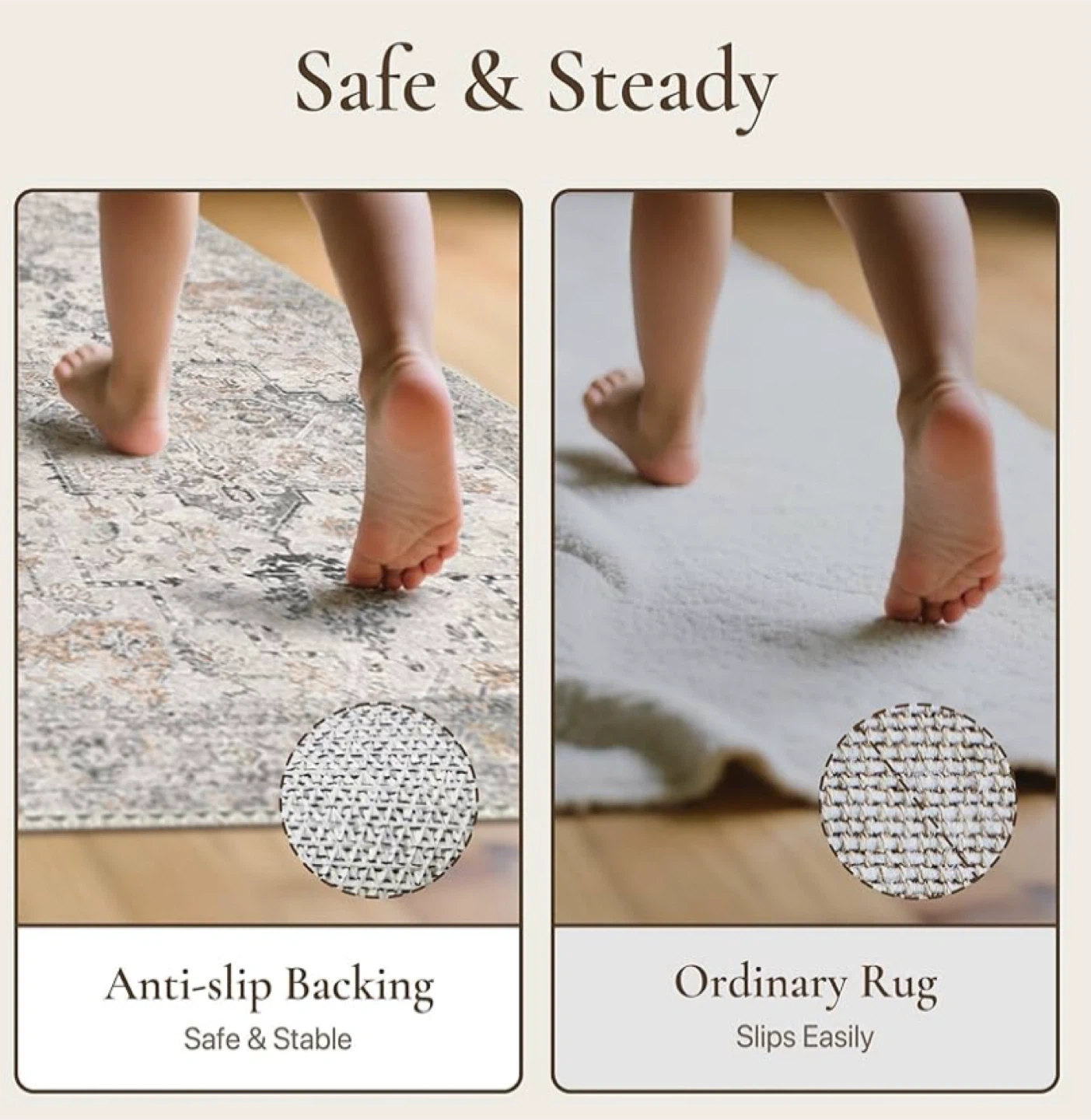 Non-Slip Backing: Our washable rugs have a high-quality non-slip backing that secures floors from scratches and keeps the rug securely in place, avoiding any shifting or slipping. It serves as a comfortable, reliable and stable cushioning for frequently used areas such as the living room, dining room, kitchen, and hallways. Prolonged placement will not discolor your flooring