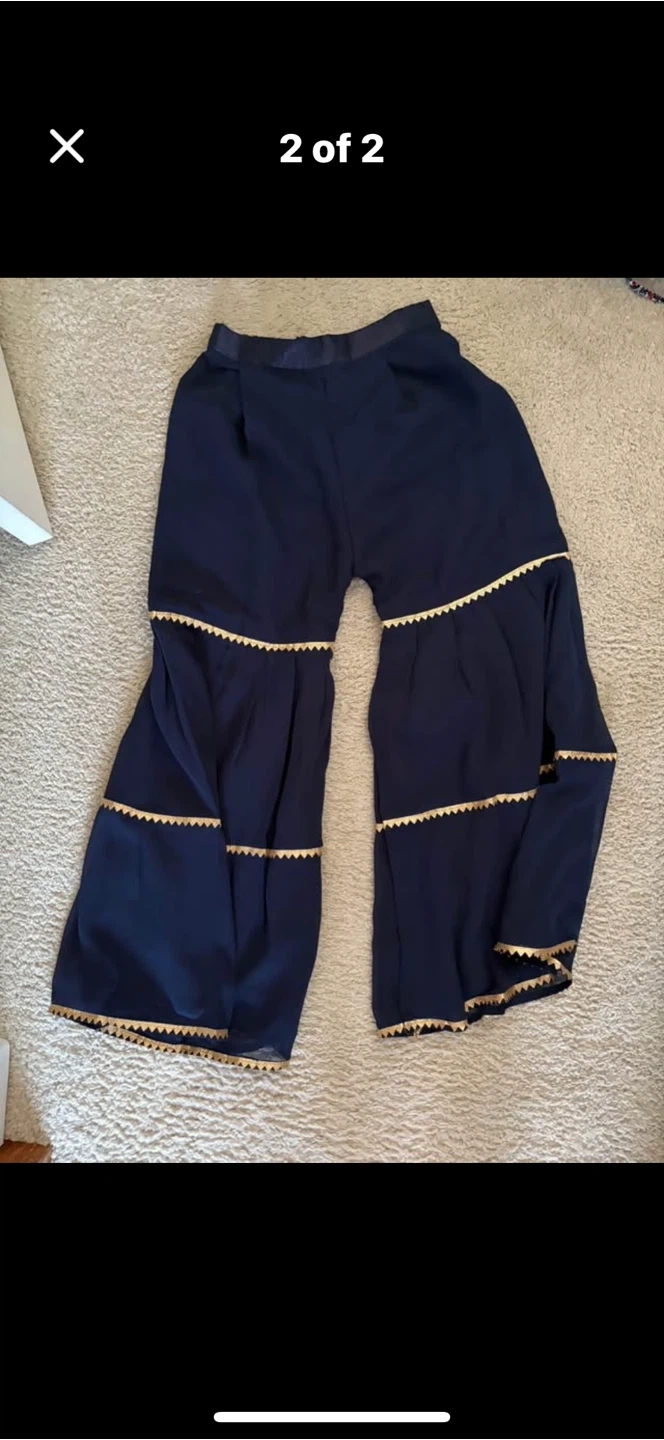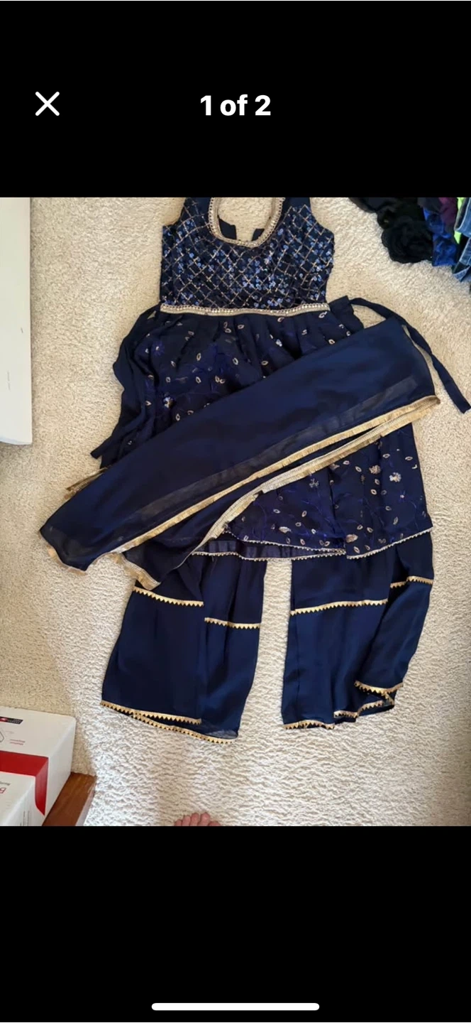 Selling a beautiful navy blue Indian outfit! It features gold detailing and a stylish design. Perfect for special occasions or cultural events. The material feels lovely and comfortable. It's in great condition and ready for a new home
