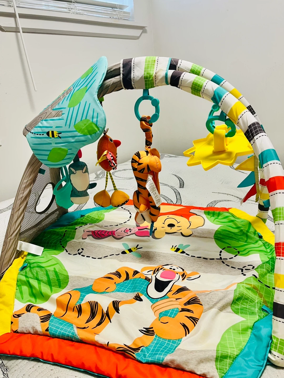 This is a Winnie the Pooh themed play gym for babies. It comes with multiple hanging toys featuring characters like Tigger, Pooh, and Piglet. The mat has a colourful jungle-like design with bees. It's great for tummy time and developing motor skills!