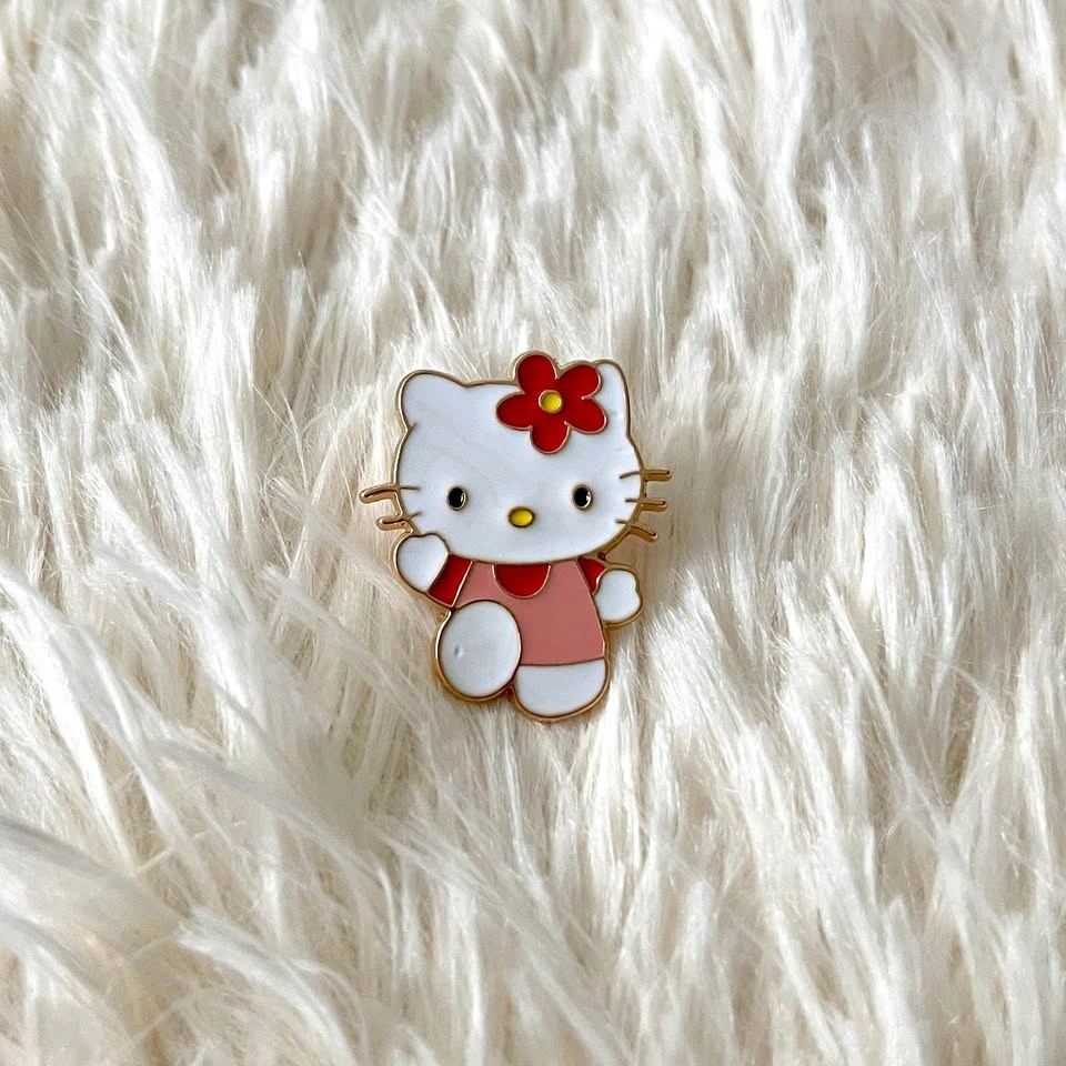 Adorable Hello Kitty enamel pin. Gold-toned metal. Features Hello Kitty in a pink dress with a red flower. Perfect for bags, jackets, or hats.