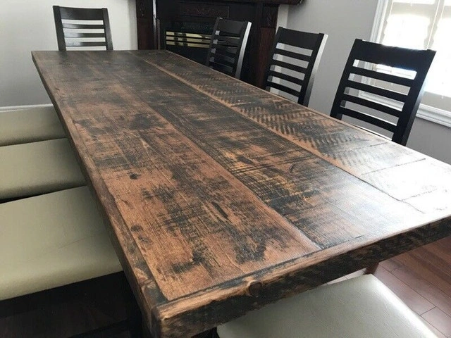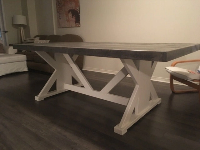 All handmade, stained and painted custom harvest tables, coffee and end tables, benches and shelves. Great for home or at the cottage! I also make outdoor harvest tables to fit the whole family! I offer 4 distinct finishes that include traditional farmhouse brown, dark walnut, and more modern grey or black. All legs and bottoms can be painted a satin black or white or fully stained. Tops are finished in a satin varnish. All outdoor tables are finished in top-line exterior products. I can build according to your dimensions and offer a few different styles for legs, from the most affordable painted post leg to fully stained trestle legs or turned wood. End tables $125, Coffee tables $300, Harvest tables 6' $750, 8' $1050, 10' $1350. Trestle legs are an extra $300. Benches $275. Located in Pottageville near 400 and Aurora Rd.