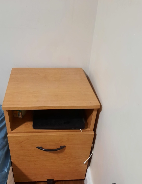 A simple wooden nightstand. It has one drawer with a black handle and an open shelf above. There's a laptop on the shelf. Useful for bedside storage.