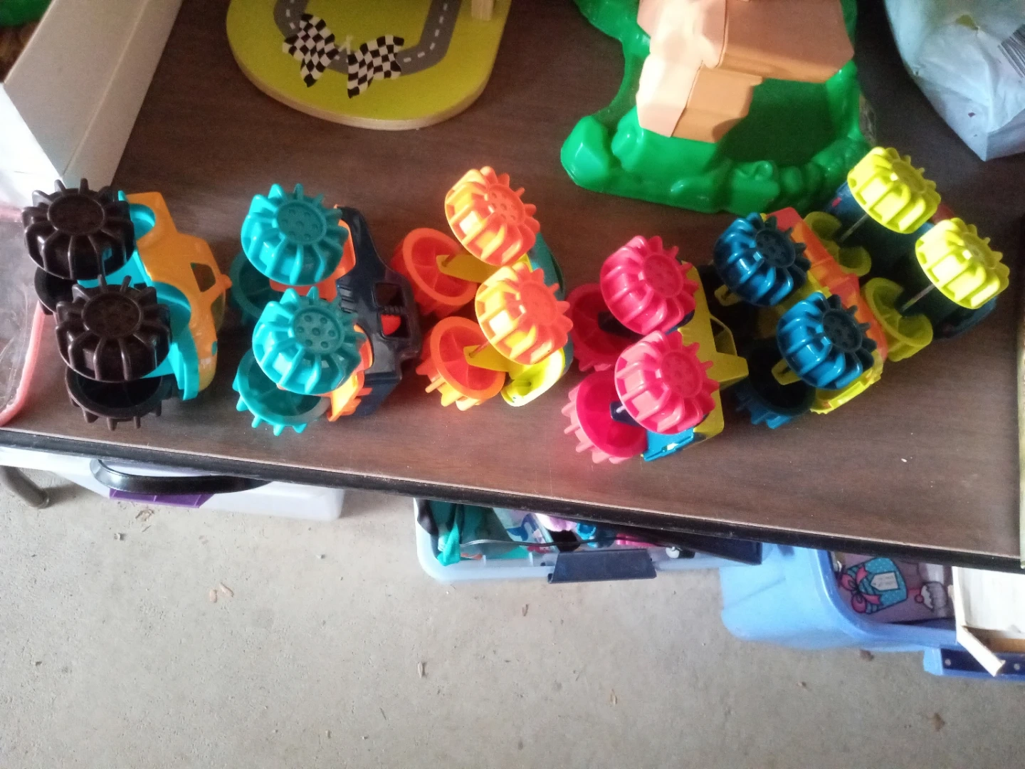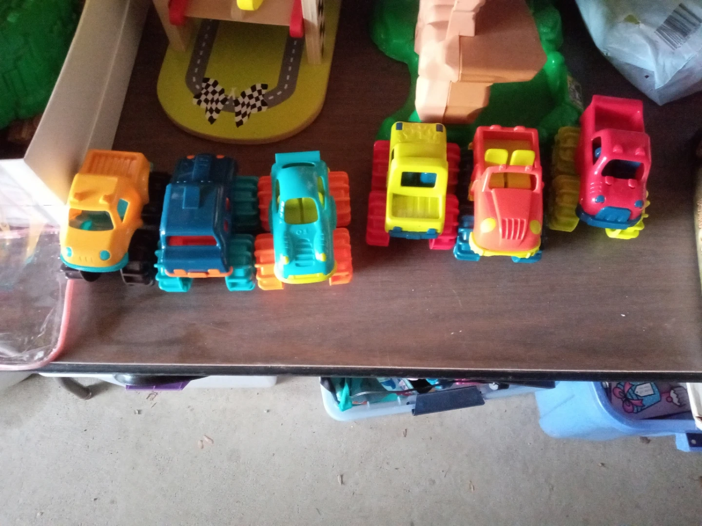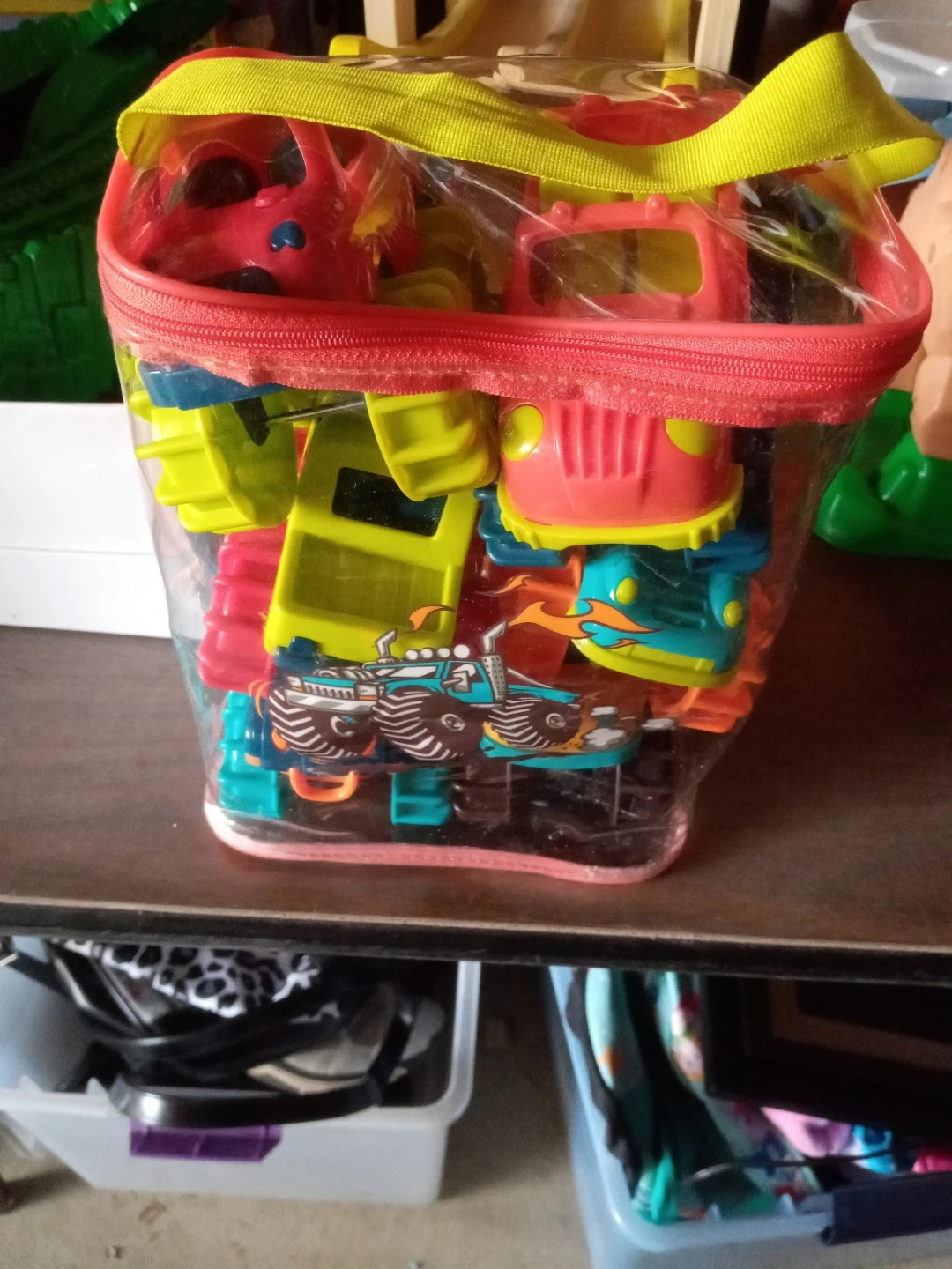 This lot includes six toy monster trucks in various bright colors like orange, yellow, blue, and red. They're made of plastic and designed for play. These trucks are suitable for children who enjoy imaginative vehicle play. Including the carrying case. All in excellent condition. From an animal and smoke free home. Cash only. Purchase and pickup in North Riverside.