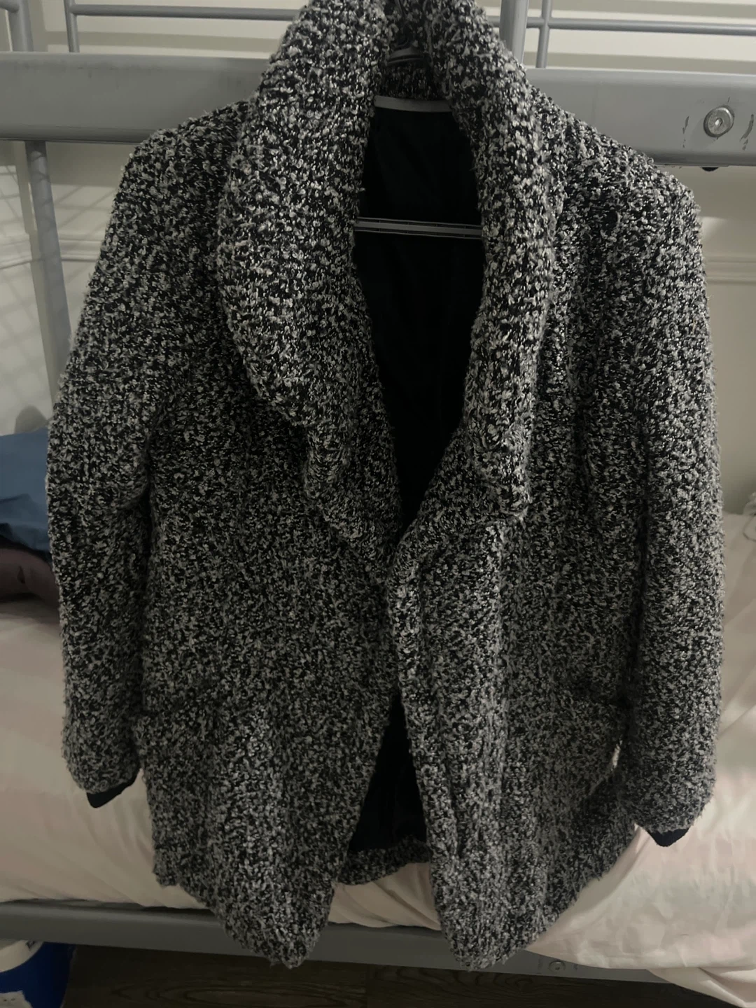This is a women's black and white bouclé knit cardigan. It's a collarless style with an open front. The material feels soft and textured.