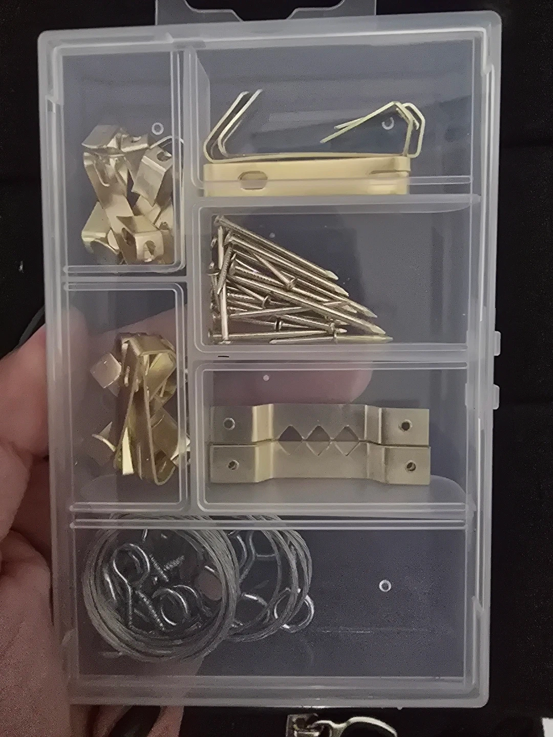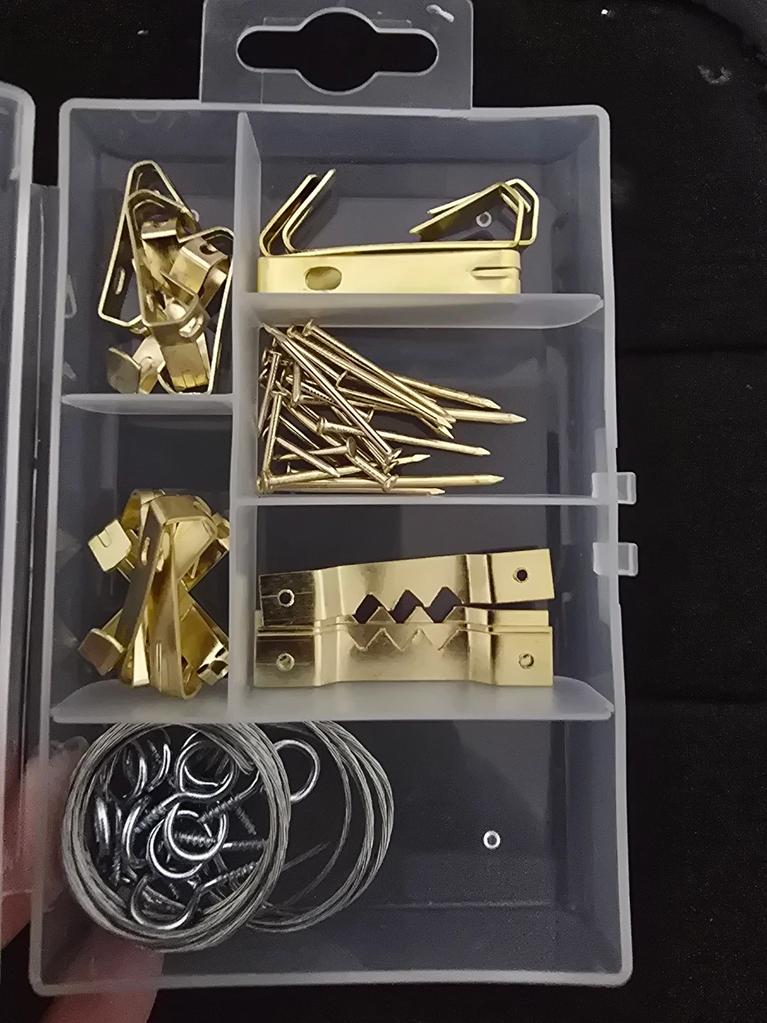 I'm selling a picture hanging kit that's still brand new! It includes various hooks, nails, and wire to help you hang up your favourite photos and artwork. Comes in a handy storage case to keep everything organized and ready to use