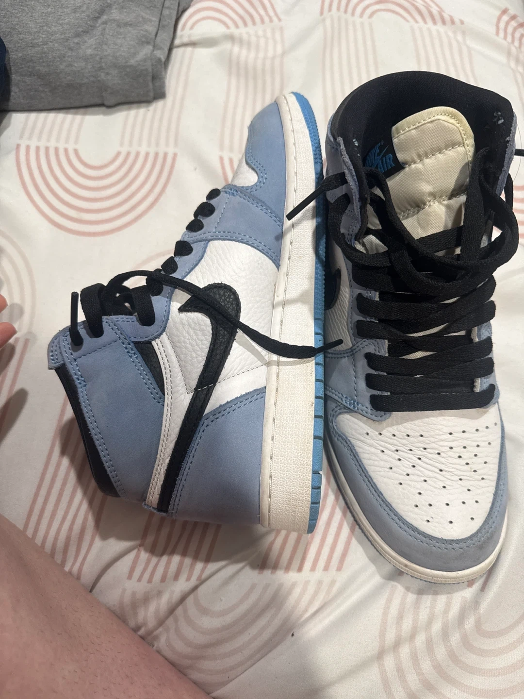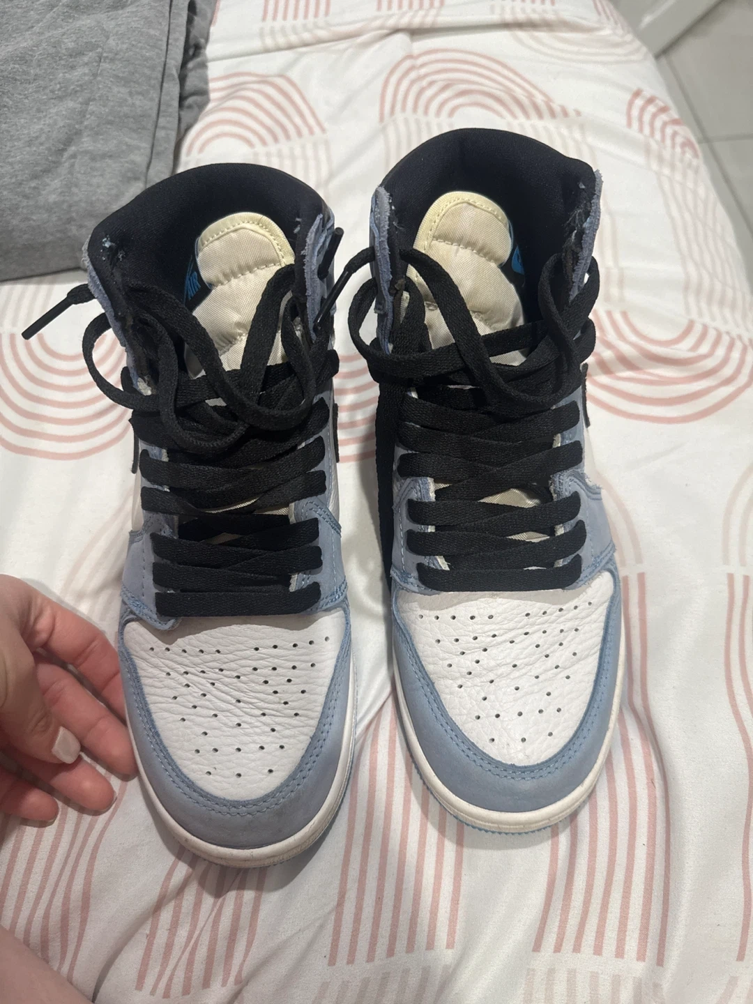 Nike Air Jordan 1 High sneakers in "University Blue" colorway. White and blue leather upper with black accents. These shoes are a high-top silhouette. Features the iconic Jordan Wings logo on the ankle.