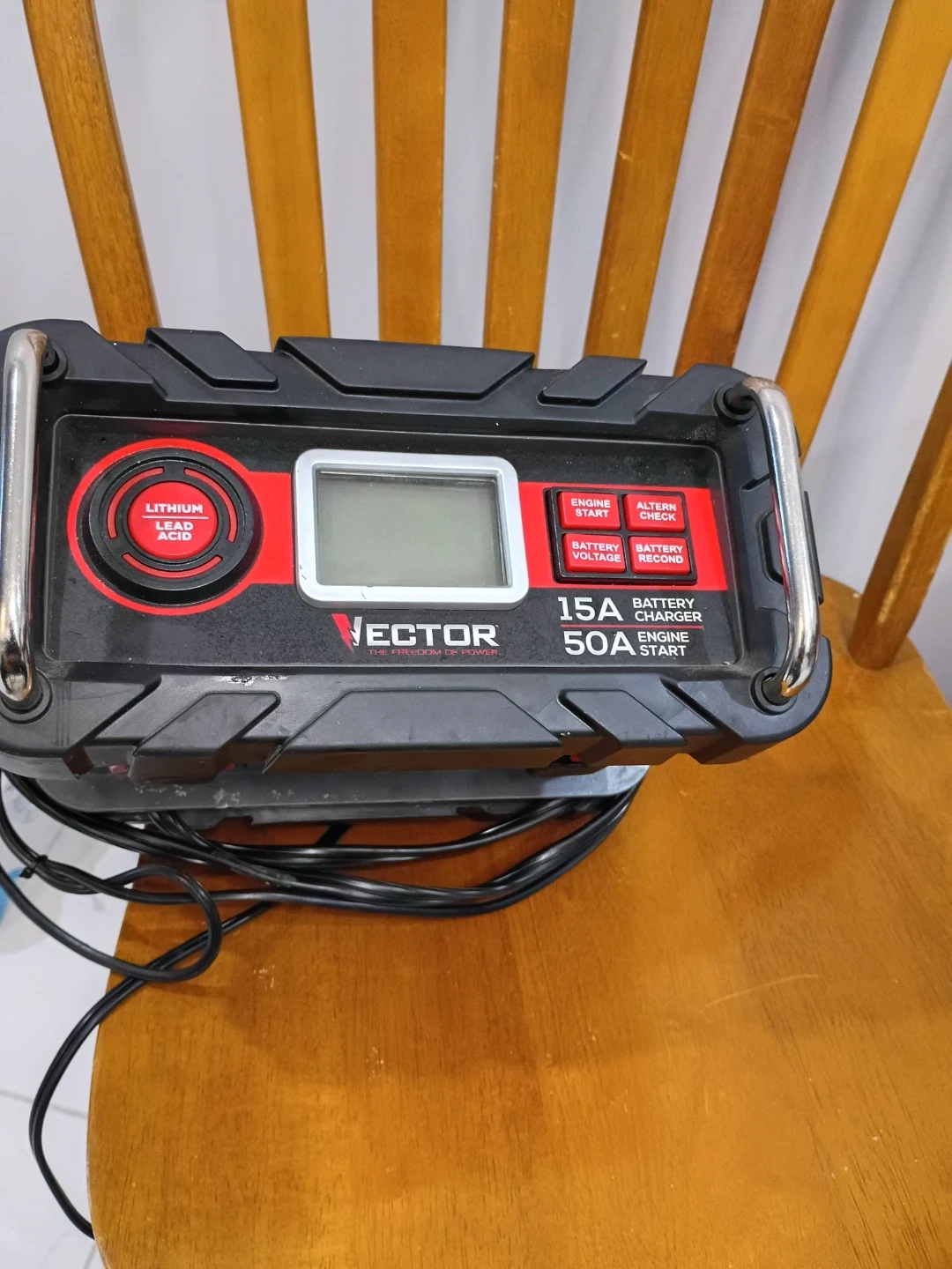 Vector 15A battery charger with 50A engine start capability. It features engine start, battery voltage check, and battery record functions. This charger supports lithium and lead-acid batteries.