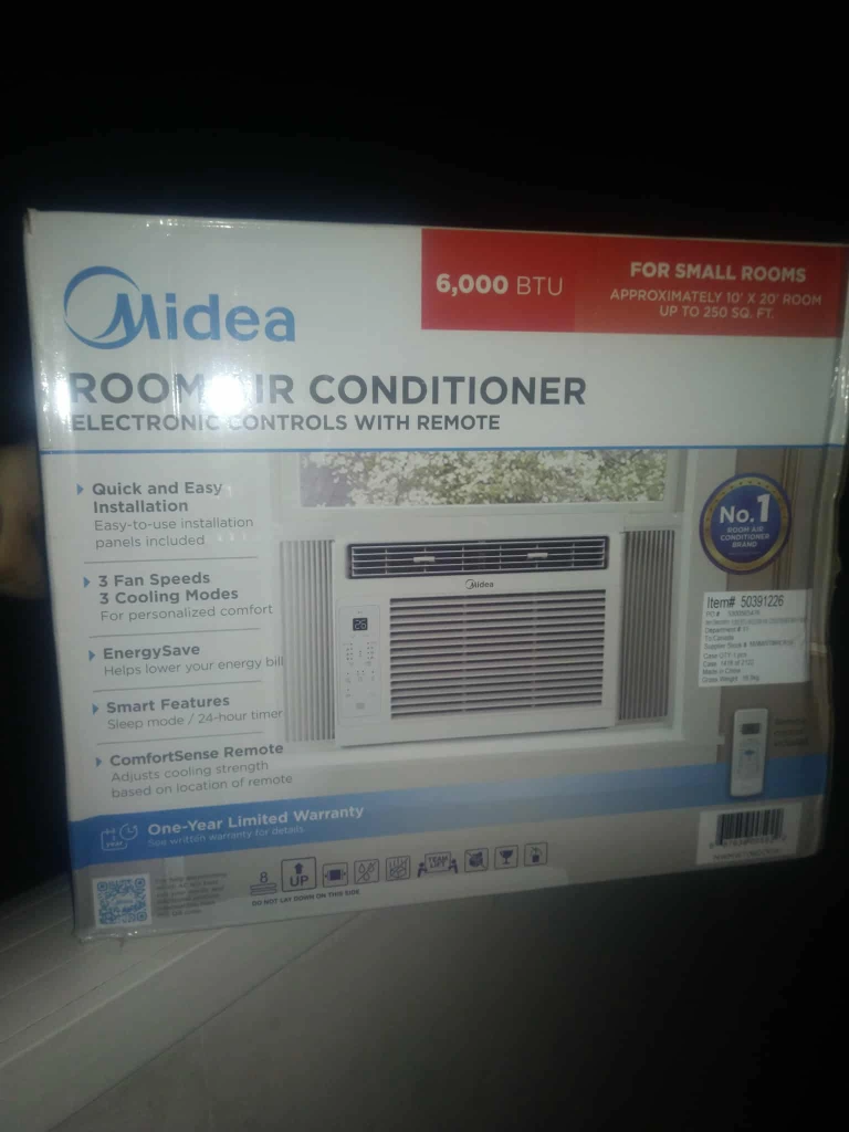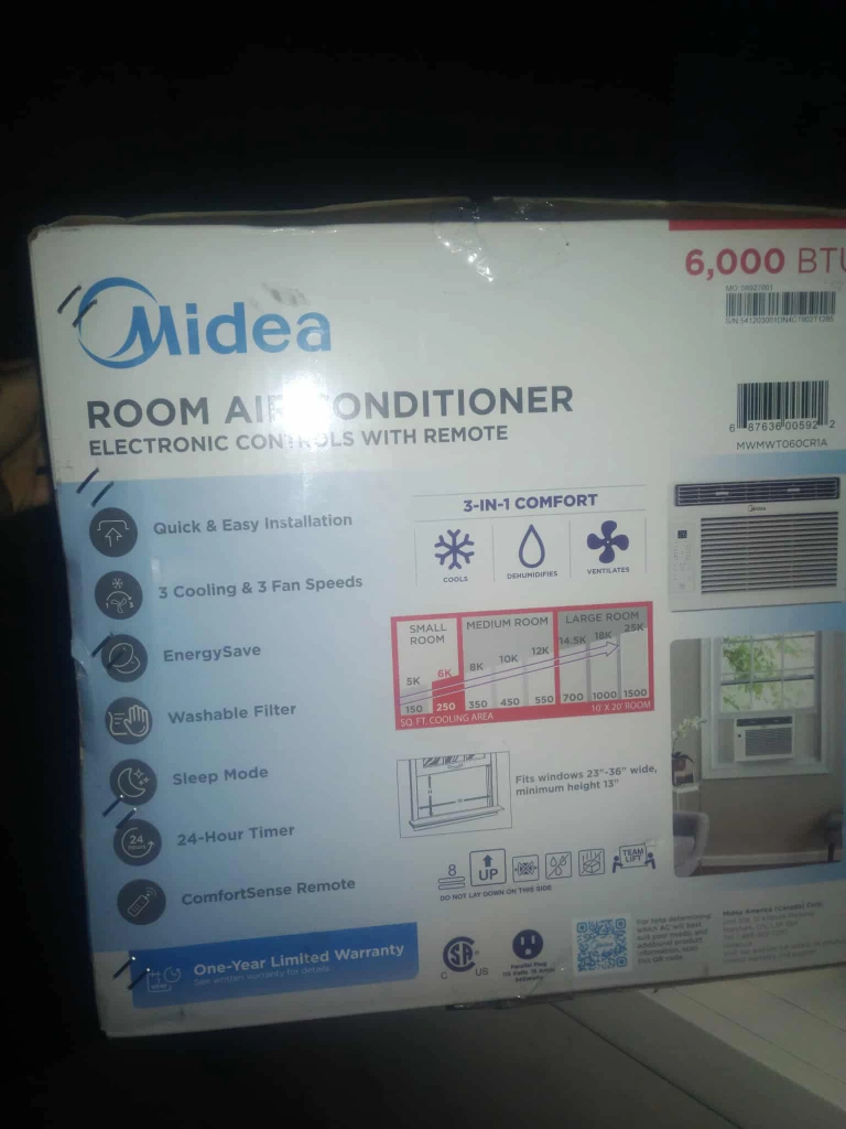 A new in-box Midea room air conditioner. Features electronic controls and a remote. Includes quick and easy installation, with 3 cooling and fan speeds. You'll get to experience the comfort of a cool and relaxing room when the weather gets hot. to