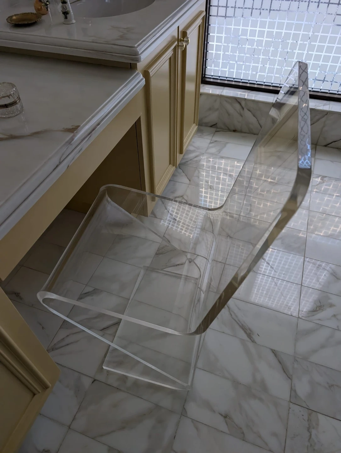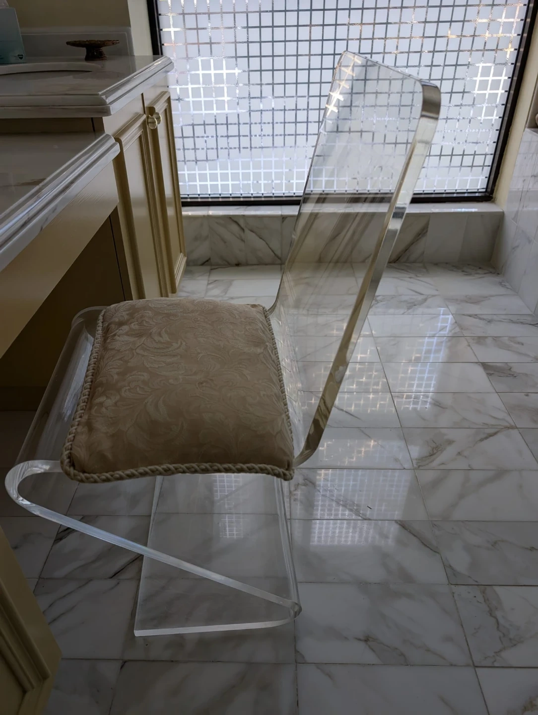 Stylish clear acrylic vanity chair featuring a comfortable, upholstered seat with a damask pattern. Its sleek design complements any modern or classic vanity setup. Perfect for a bedroom or bathroom space.