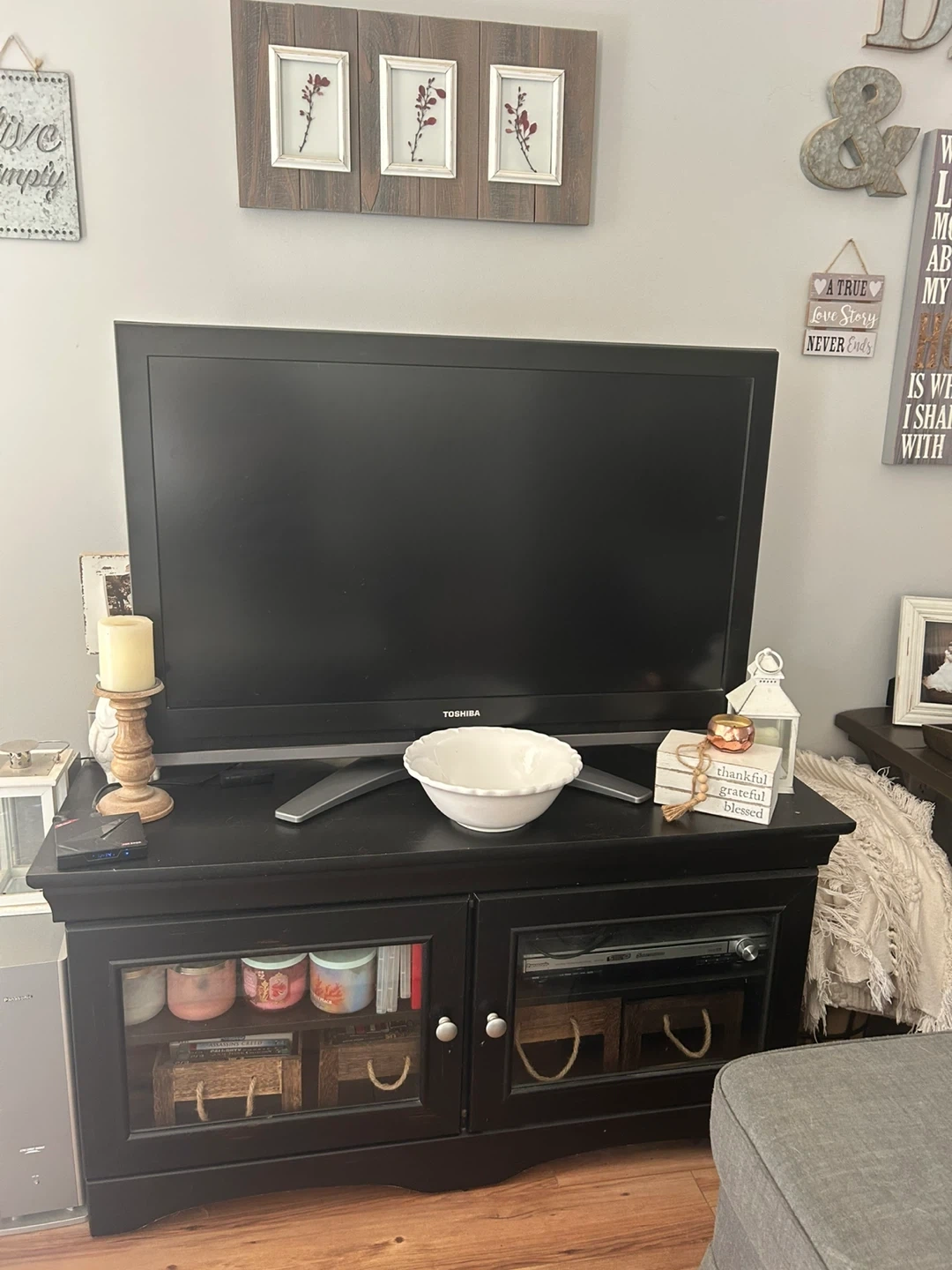Stylish TV cabinet in excellent condition. Made of wood with glass doors. Measurements: L-48”, D-20”, H-24”. Price negotiable. Pick up at Derry/Thompson, Milton.