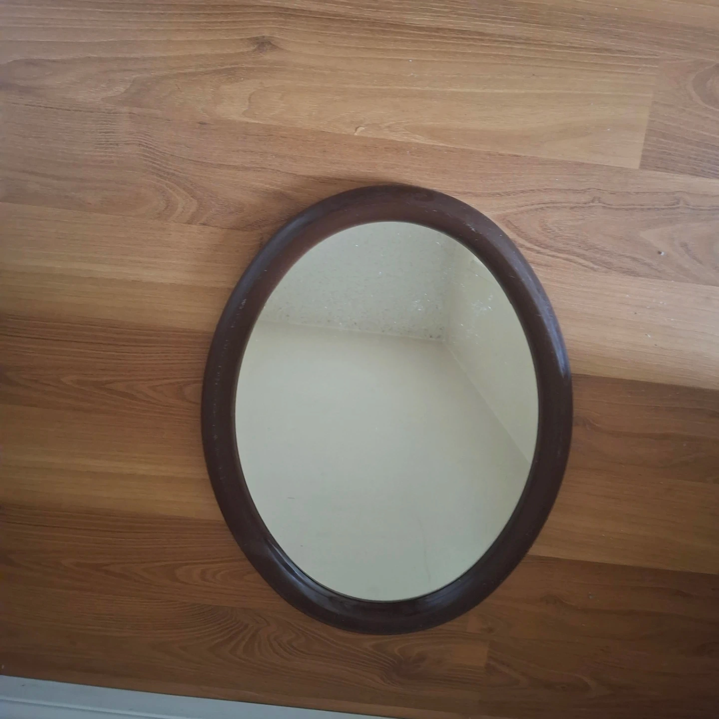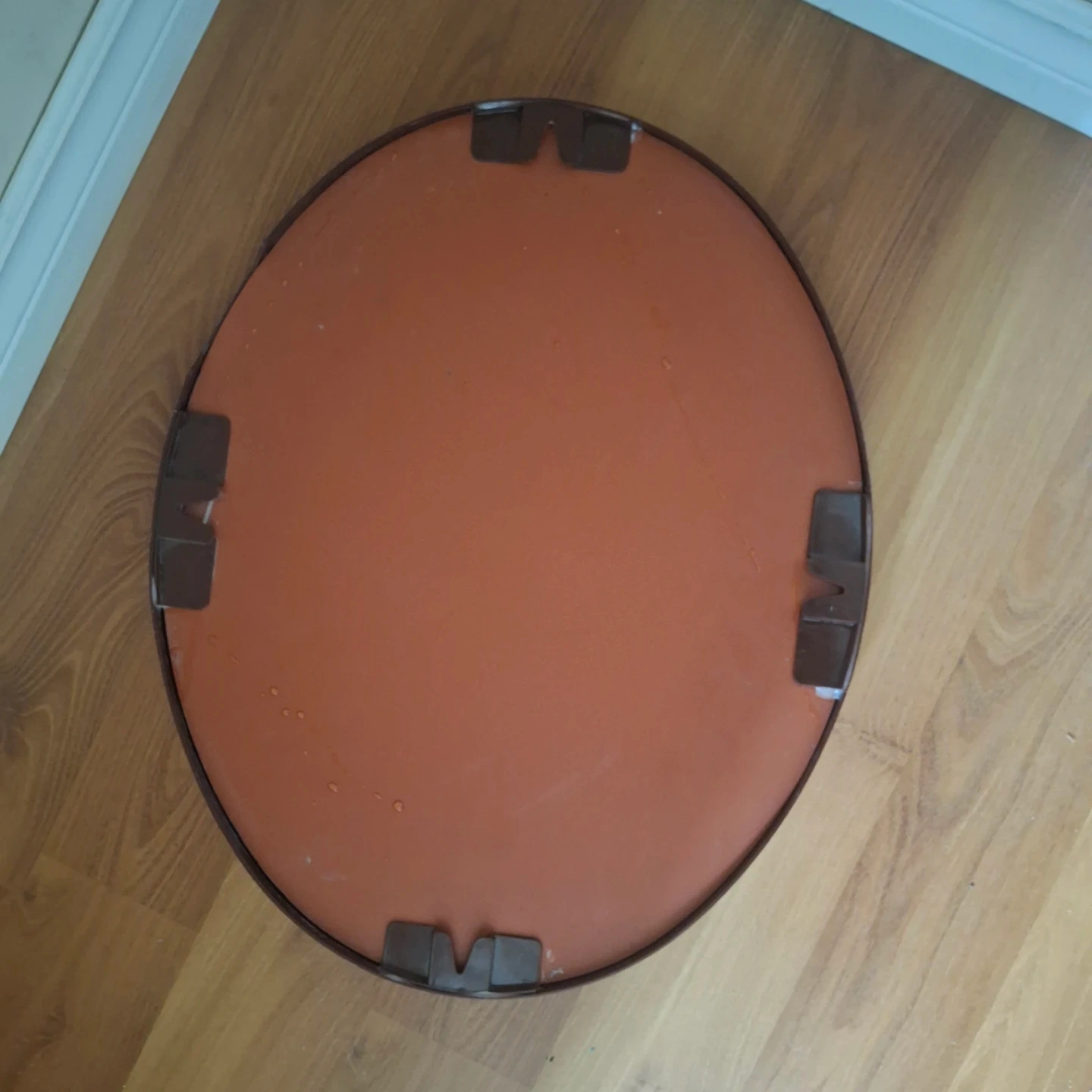 A simple oval mirror with a dark brown plastic frame. The back has clips for mounting.