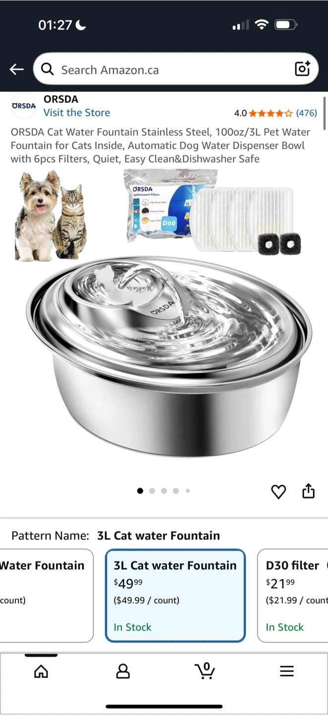 This ORSDA cat water fountain is made of stainless steel and has a 3L capacity. It's quiet, easy to clean, and dishwasher safe.