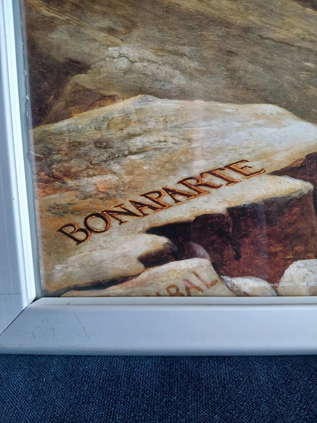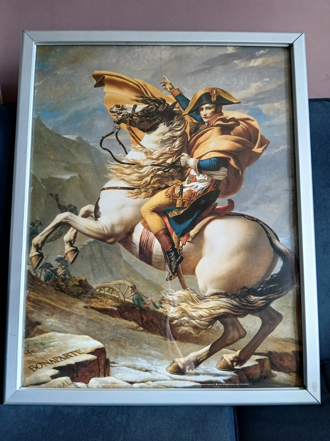 Artist: Jacques- Louis David ( French, 1748-1825. Subject: Napoleon Crossing the Alps at the Saint-Bernard Pass shown as figure atop a fiery, rearing stallion to emphasize his leadership and power.