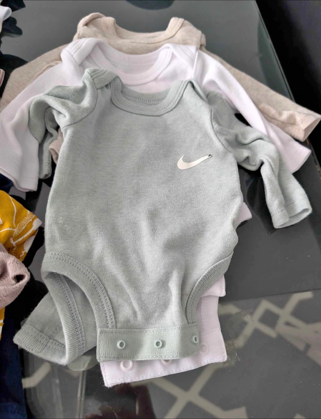 3 long sleeved onesies with envelope shoulders. Nike.